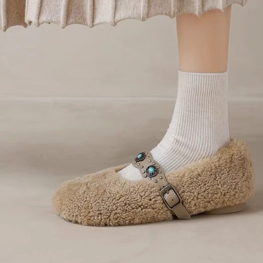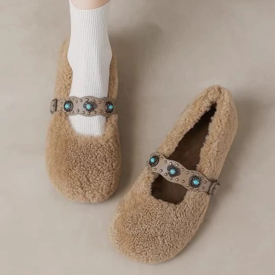 📚 羊羔毛单鞋女~手工秋冬加绒保暖圆头一字带铆钉低跟平底毛毛鞋子