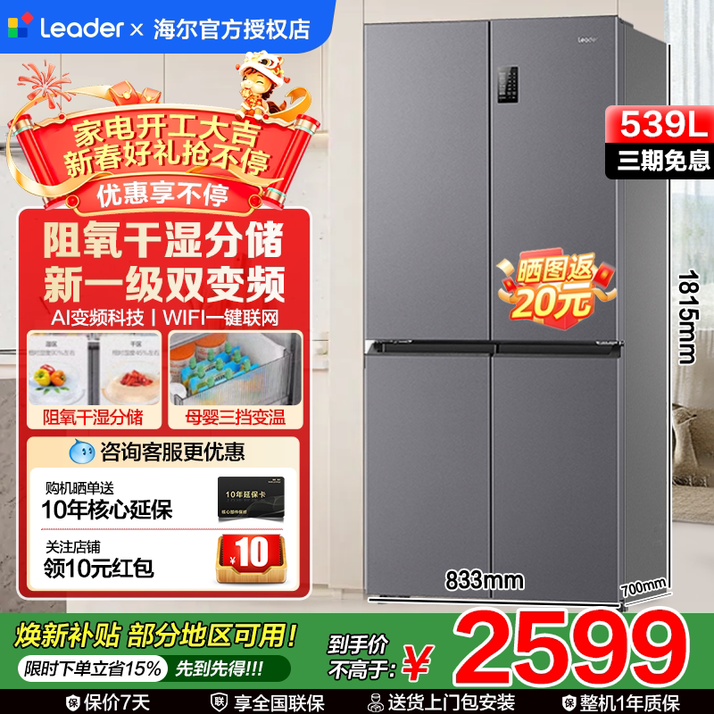 📚 焕新补| 海尔电冰箱大容量539升十字四门家用无霜Leader560一级