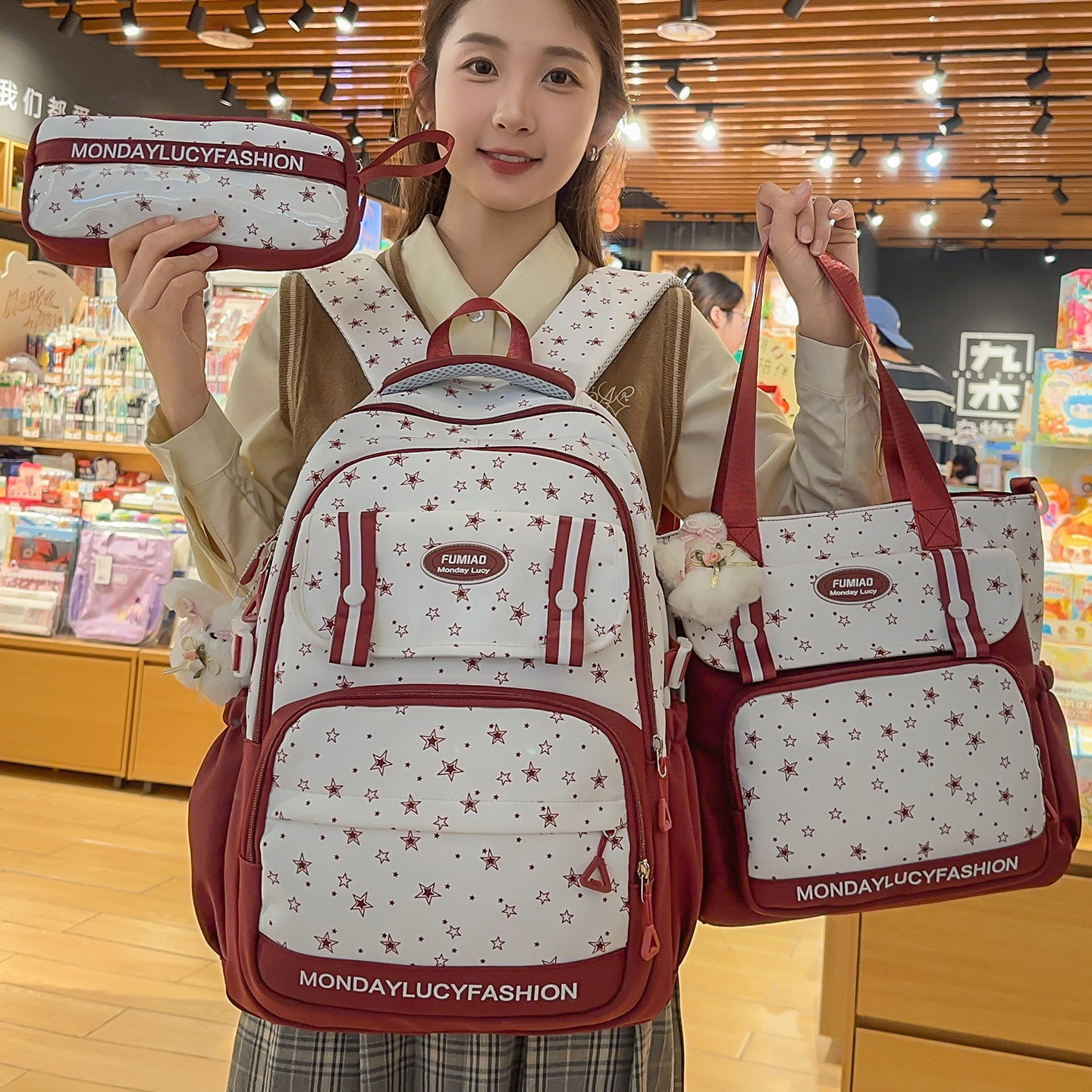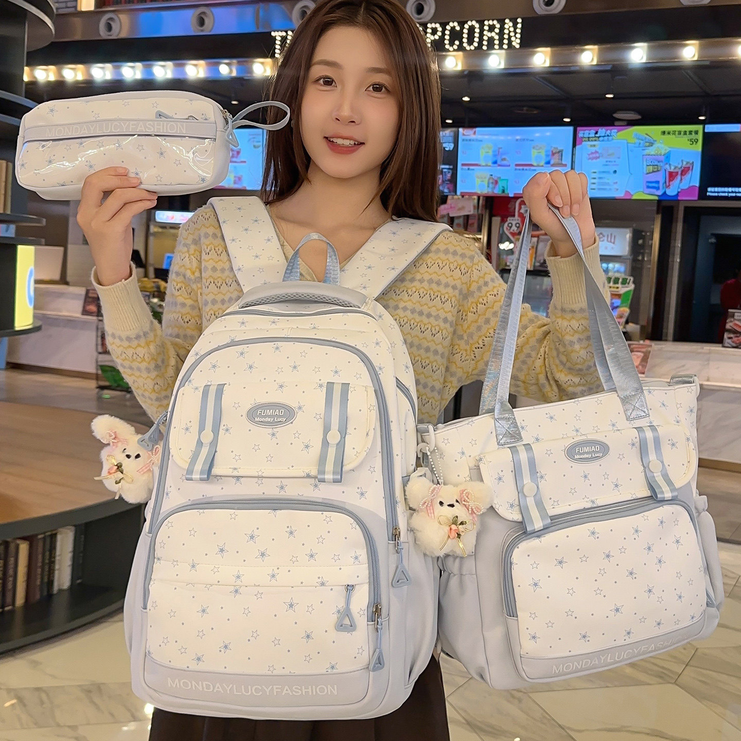 📚 小清新可爱书包女初中生大容量三件套高颜值小学生星星印花双肩包