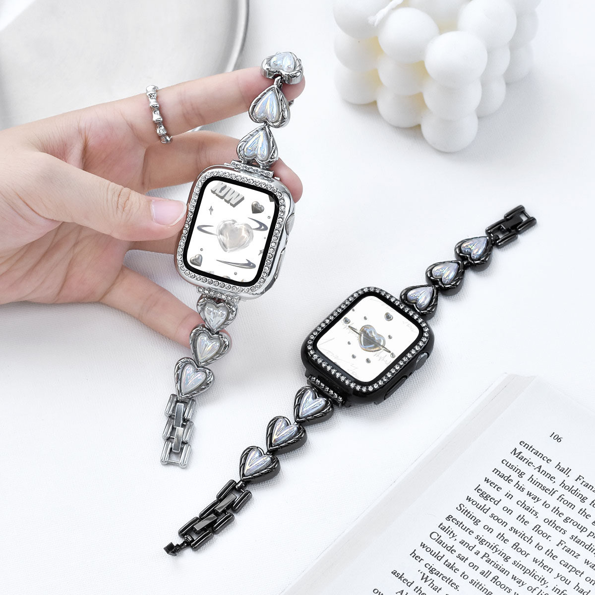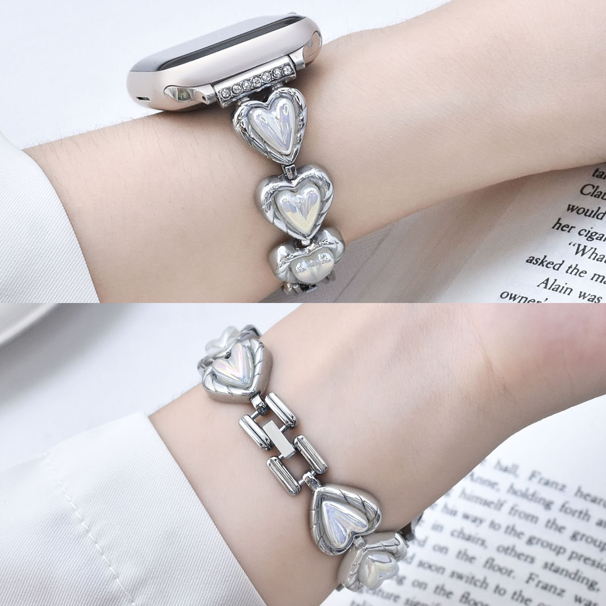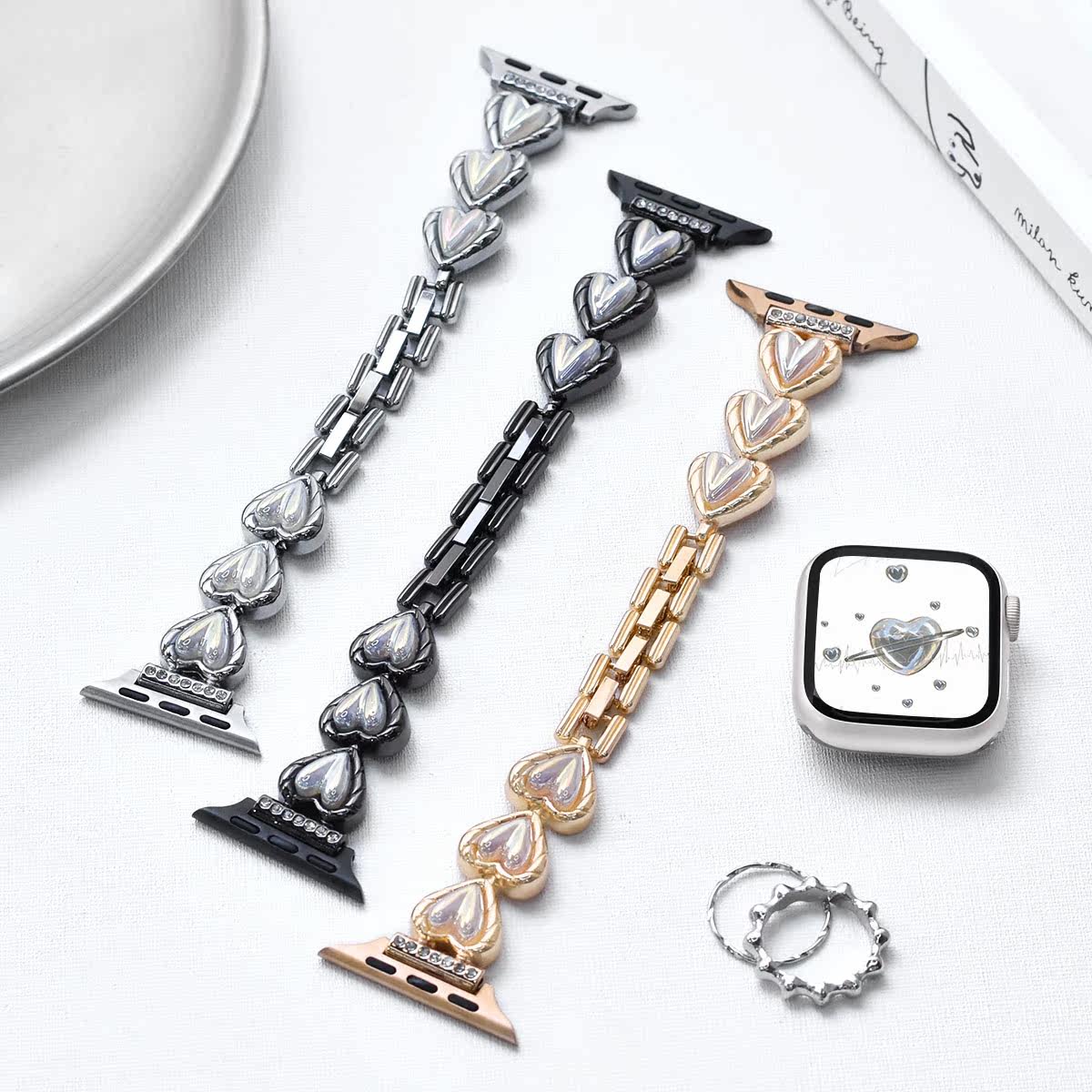📚 适用于iwatch S10爱心表带applewatch S9金属表带S7/8代苹果手表SE/6/5/4镭射贝母不锈钢手链新款高级感夏