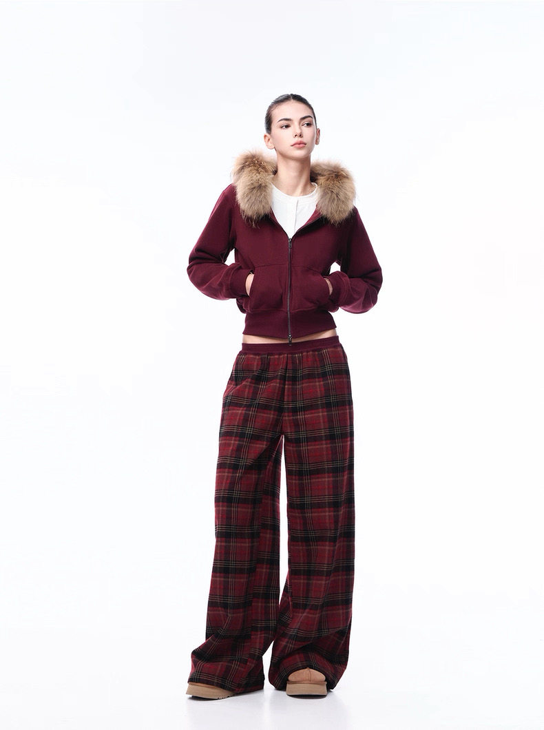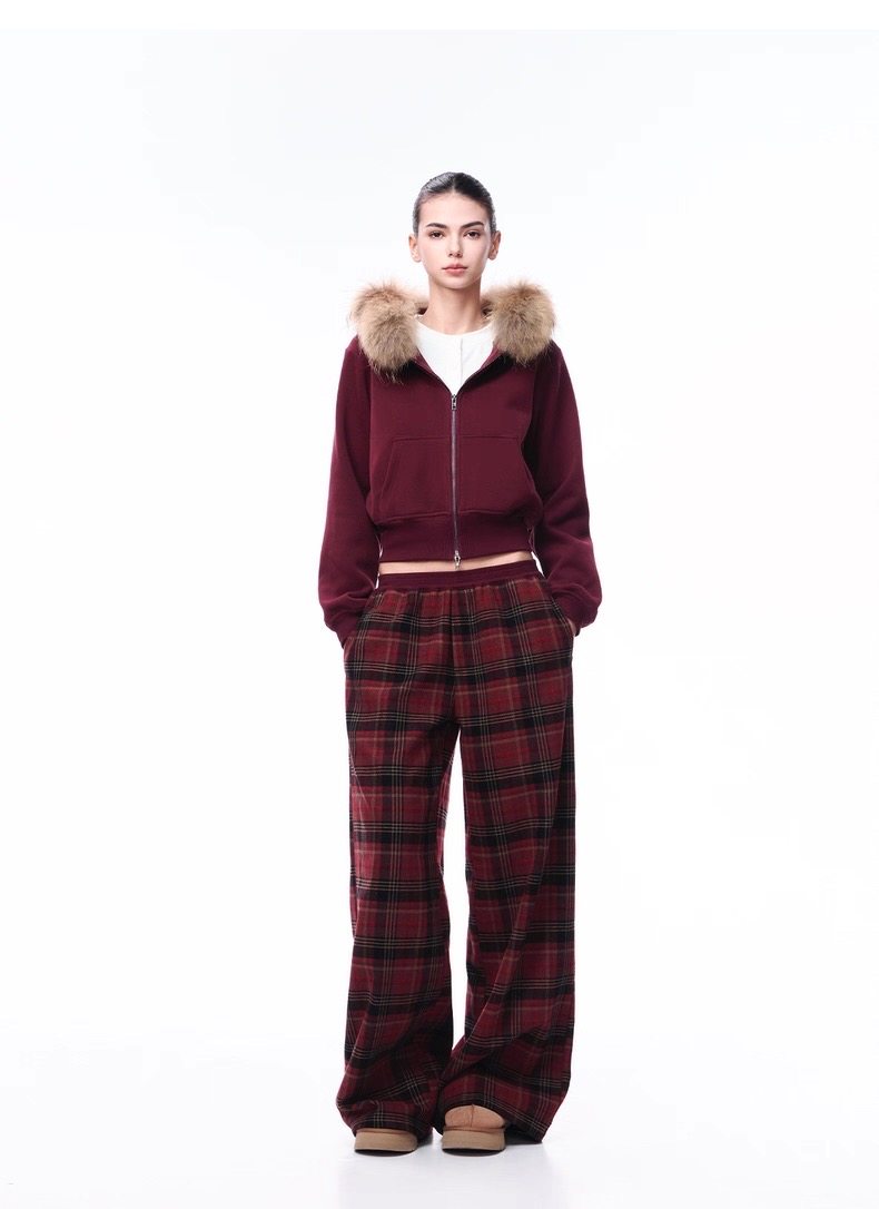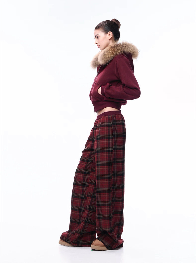 📚 JLAUNT 红色格子阔腿裤女宽松卫裤百搭低腰美式复古直筒休闲裤子