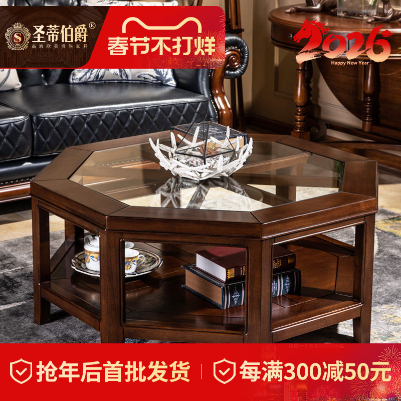 📚 美式全实木茶几桌异形玻璃镂空客厅家具设计师款八角茶台咖啡桌子