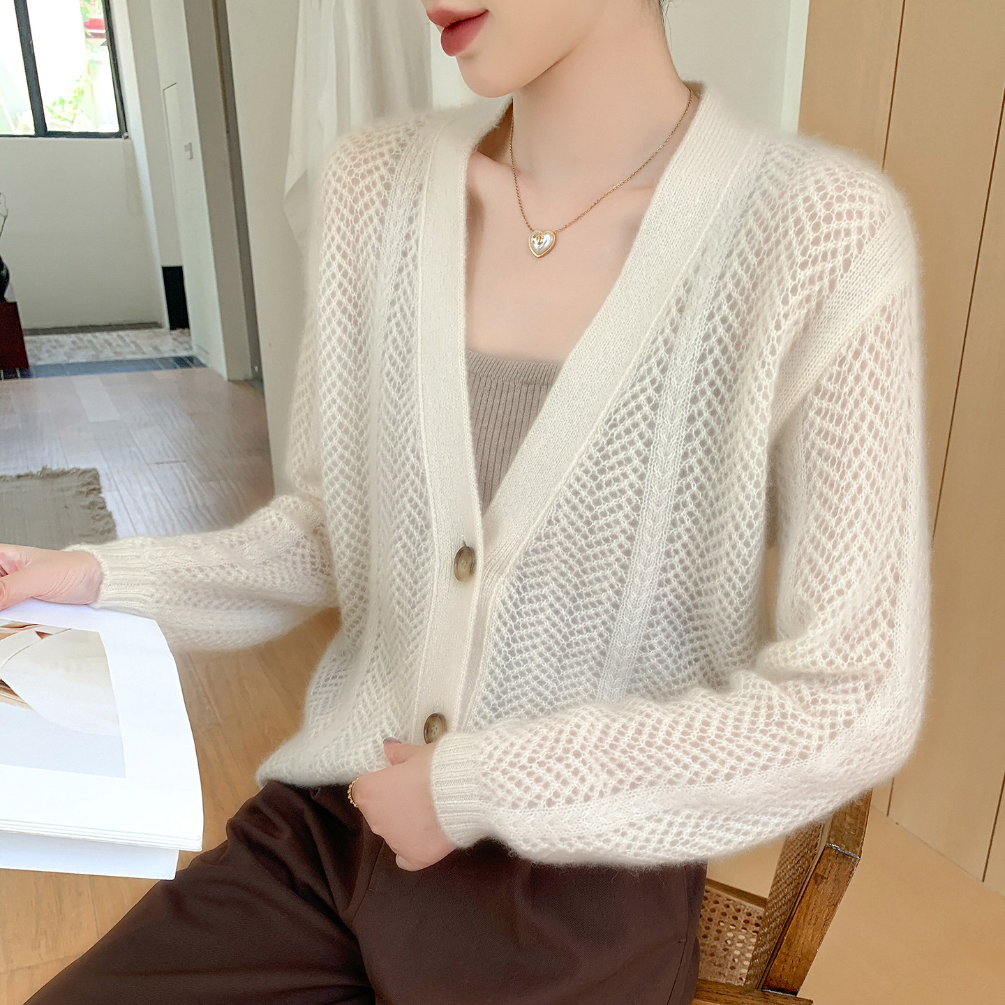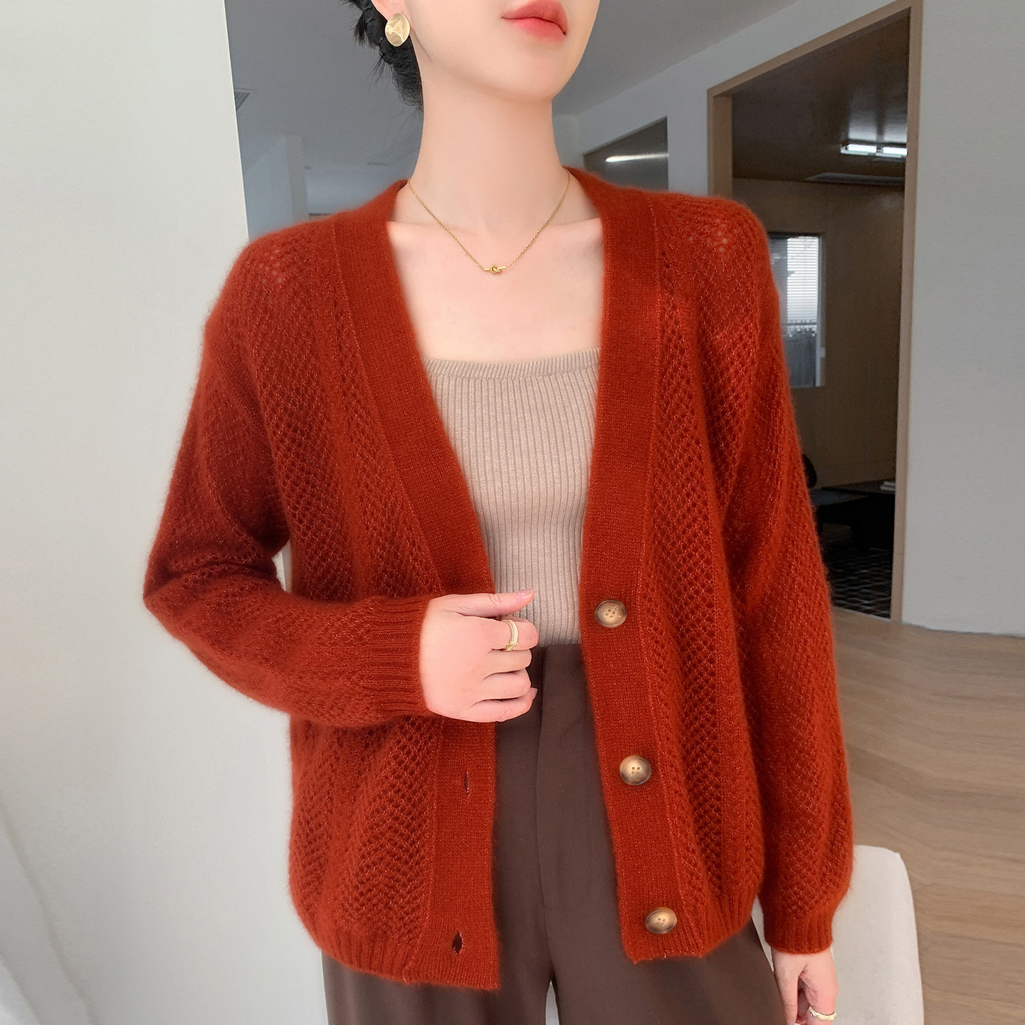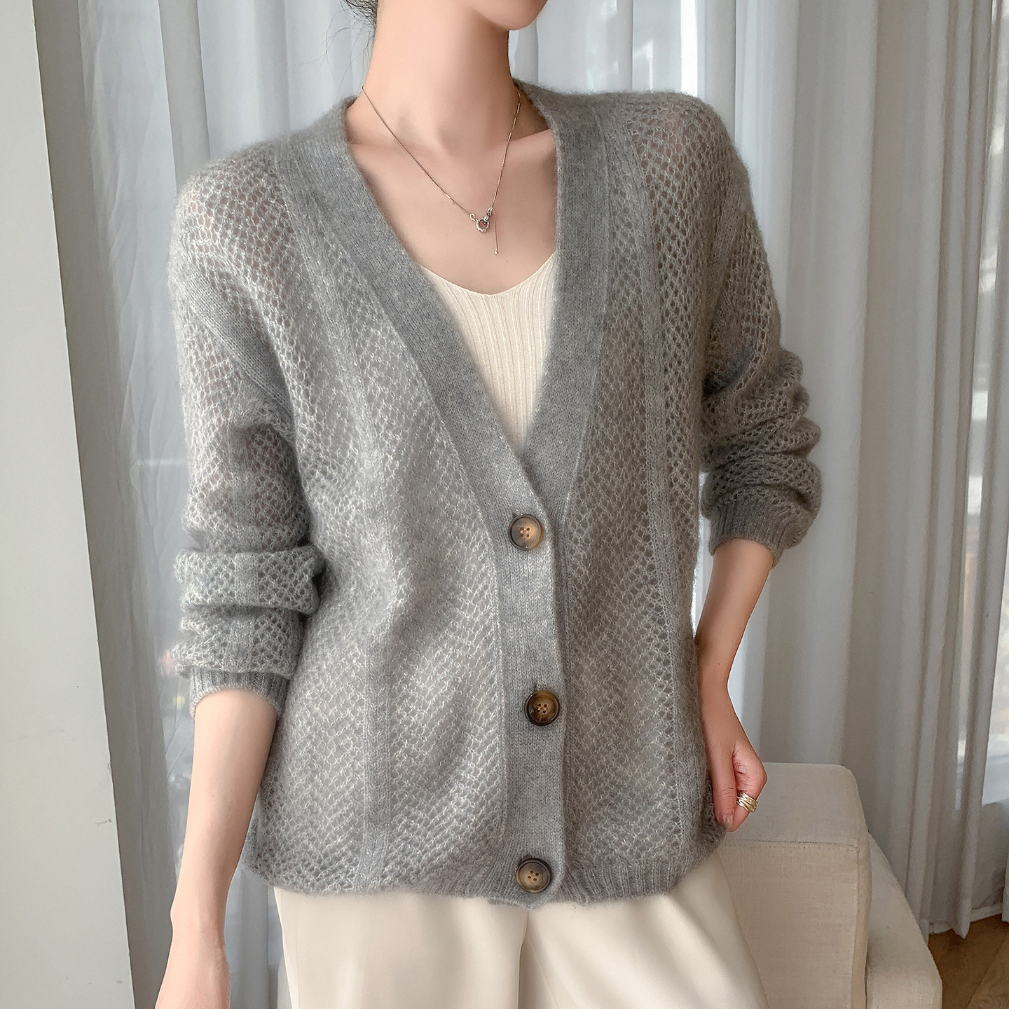 📚 康宝莱纱线~桑蚕丝山羊绒开衫女镂空V领宽松外搭毛衣春季新款外套