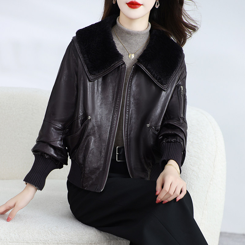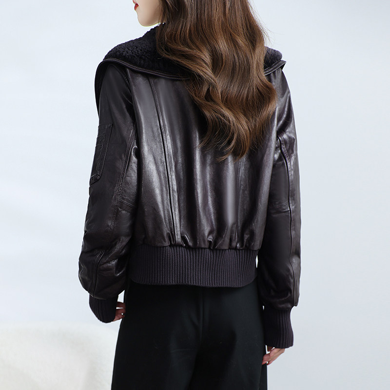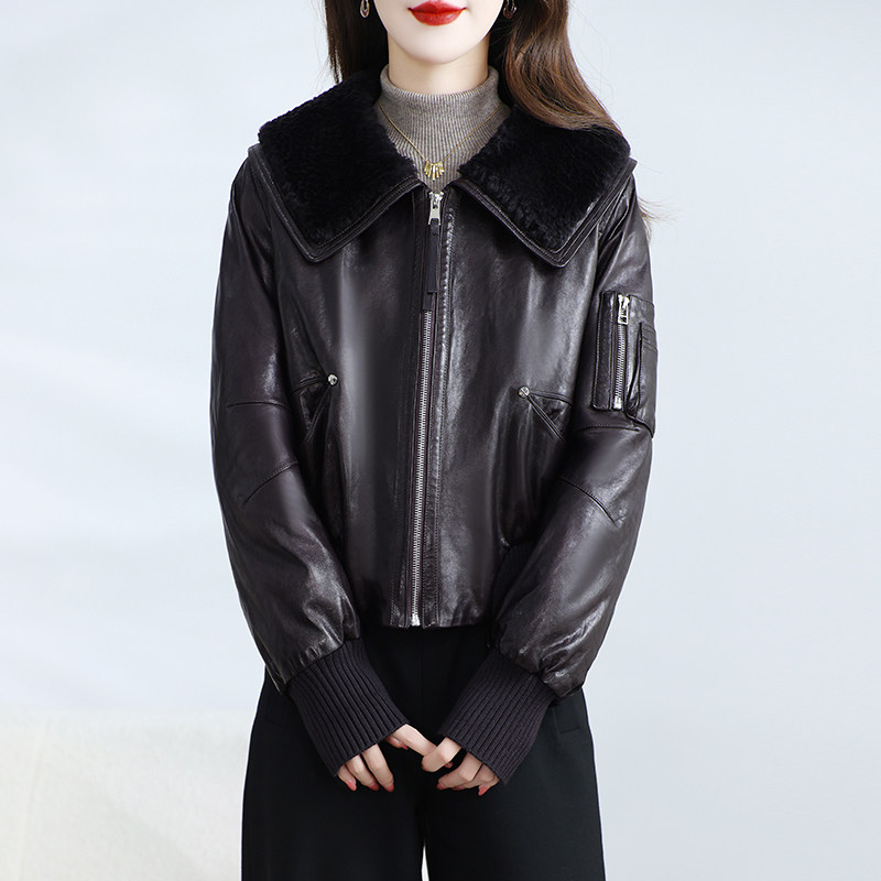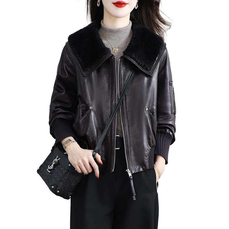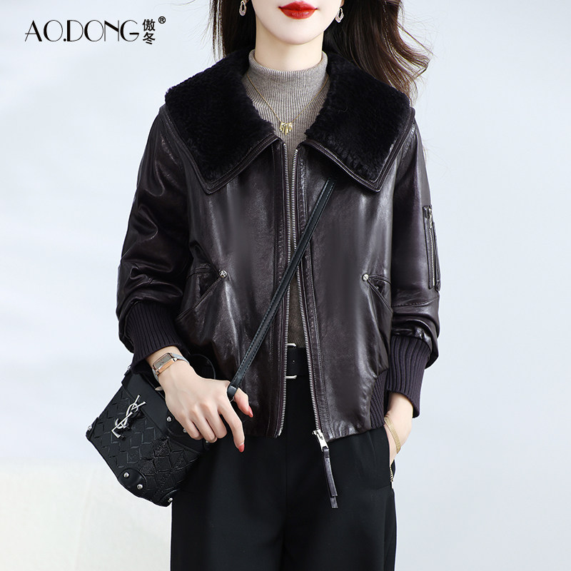 📚 海宁真皮皮衣女短款高级感油蜡绵羊皮鹅绒服小个子羊毛领外套冬季