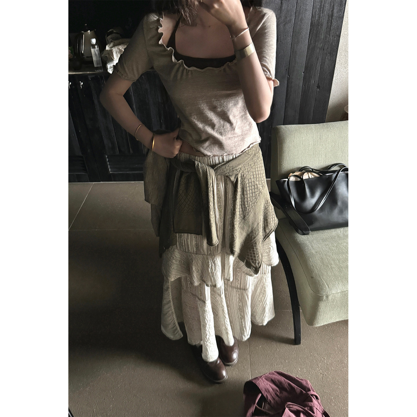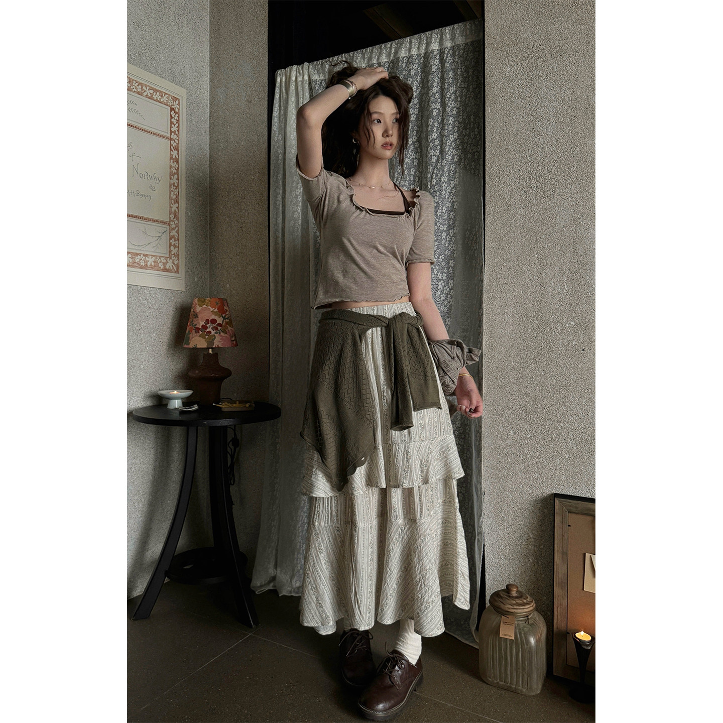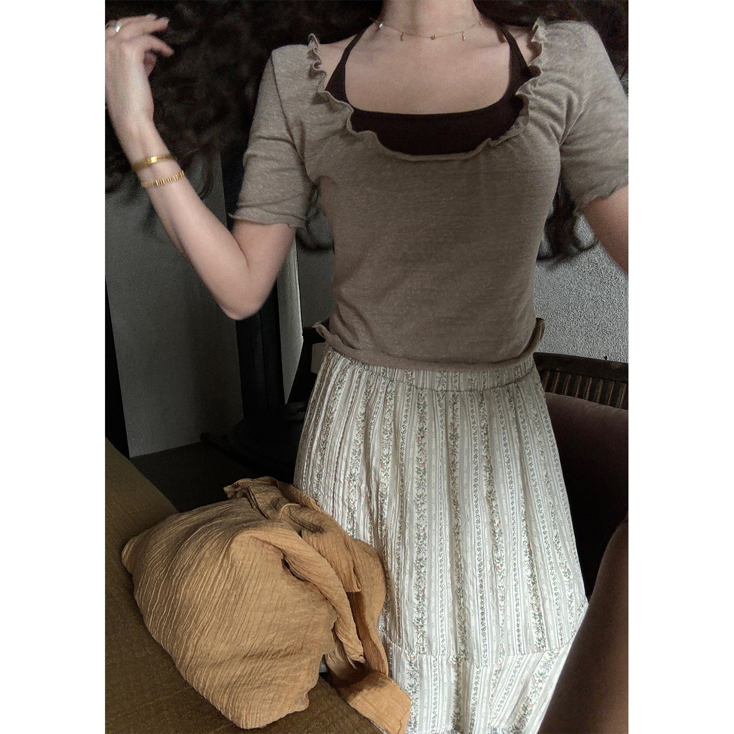 📚 JMWOMEN"燕麦米灰"复古木耳边短袖T恤女夏季吊带背心层次感两件套