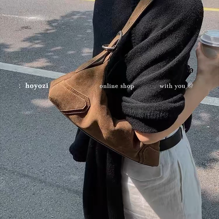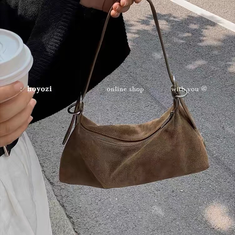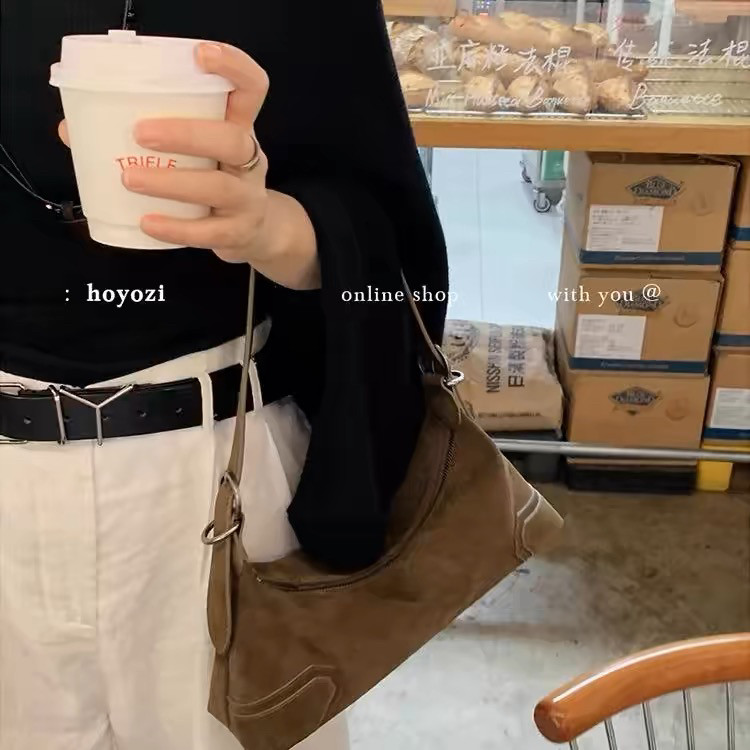 📚 美式小众设计轻奢高级鹿皮绒复古美拉德软皮磨砂酷辣妹机车腋下包