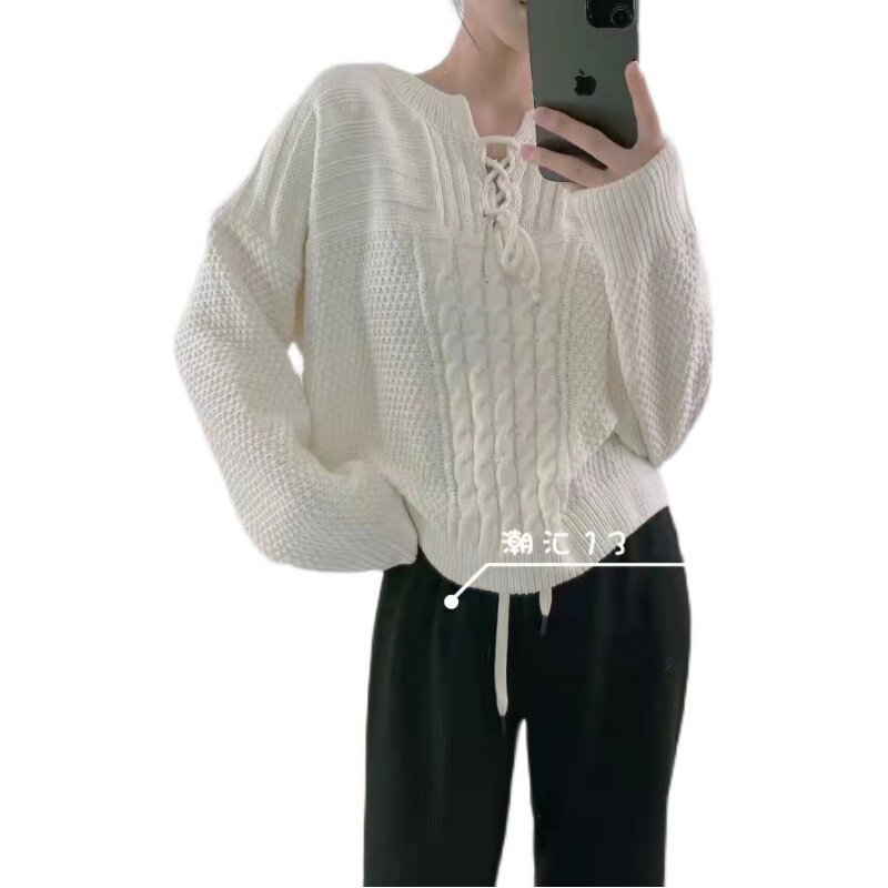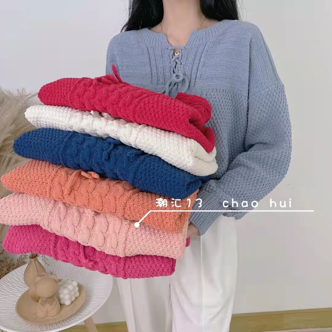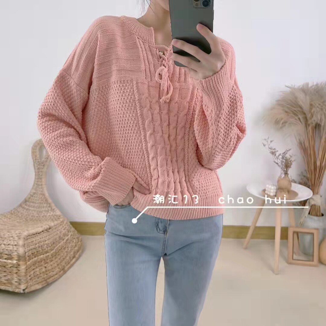 📚 港风玫红树莓粉橘红色V领系抽绳雪尼绒加厚针织毛衣女宽松上衣冬