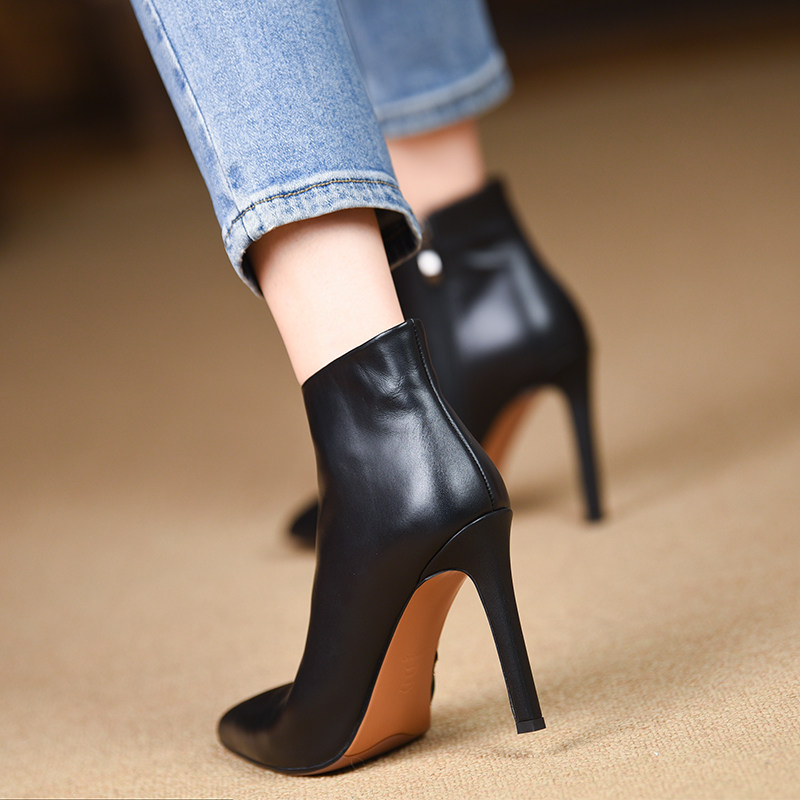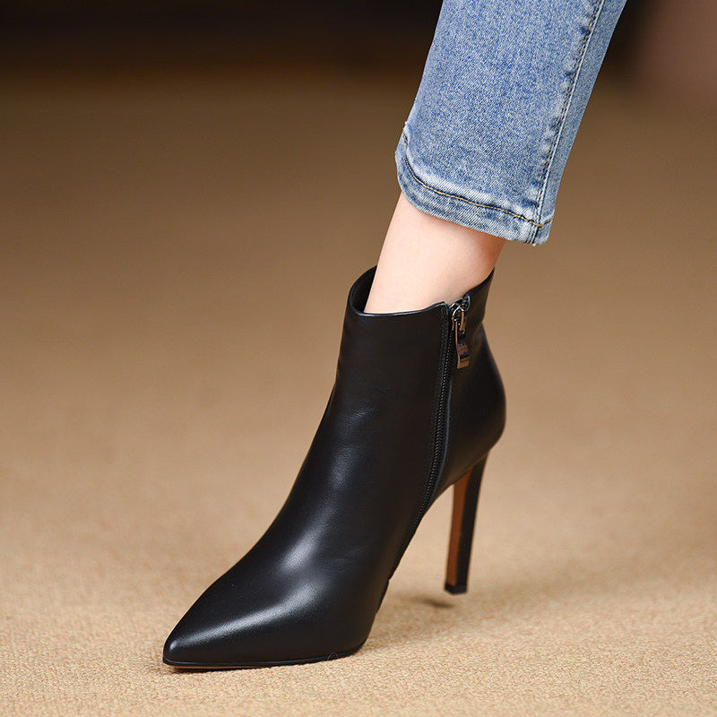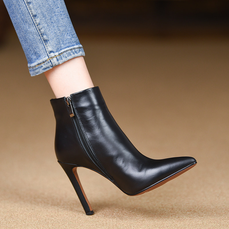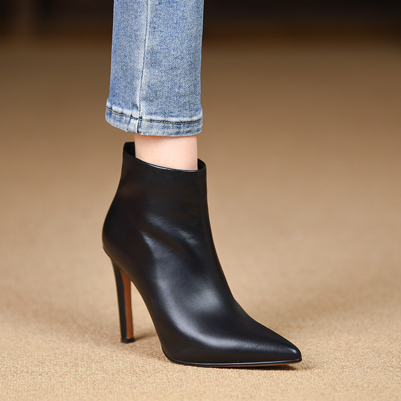 📚 misili时尚尖头细跟短靴秋冬季新款10cm高跟鞋黑色平底真皮女靴子