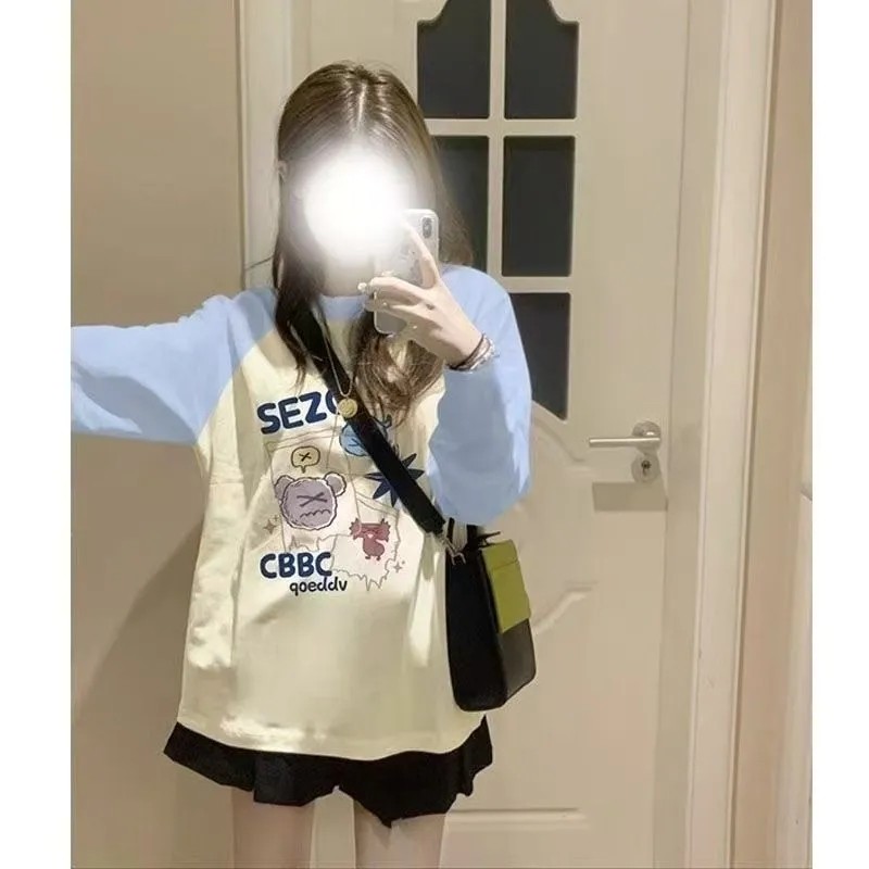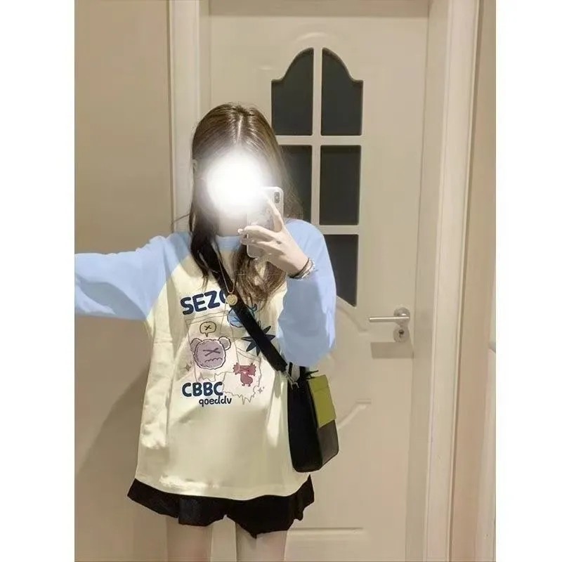 📚 纯棉蓝拼杏色长袖通勤小众t恤休闲韩版宽松oversize甜美外穿卫衣