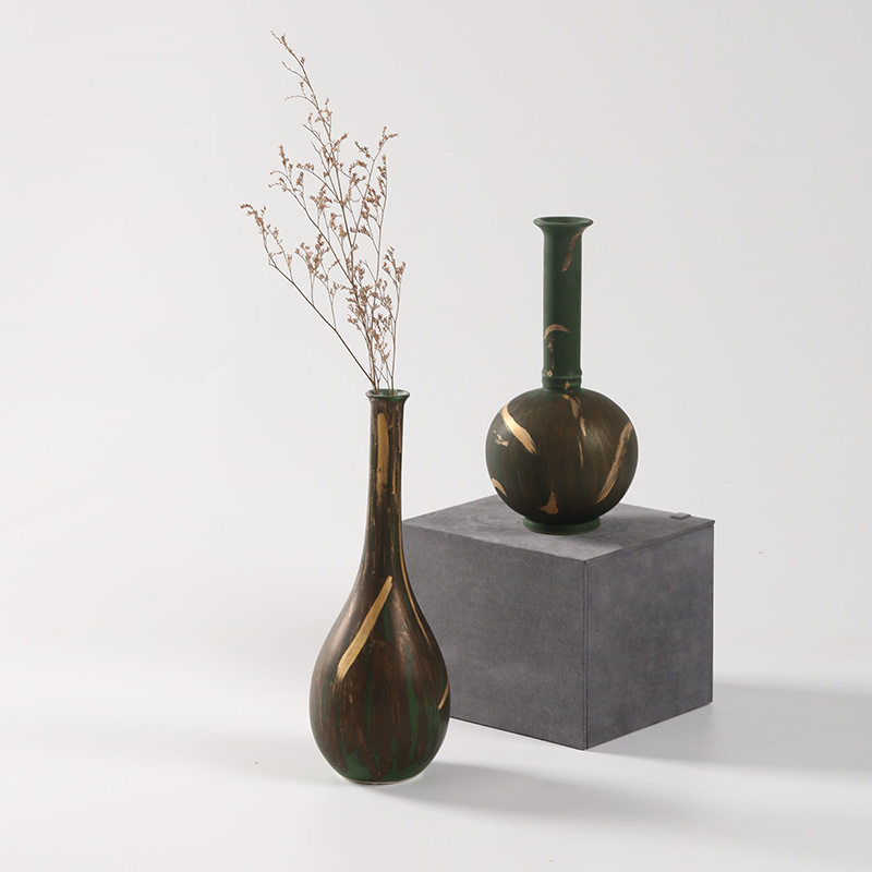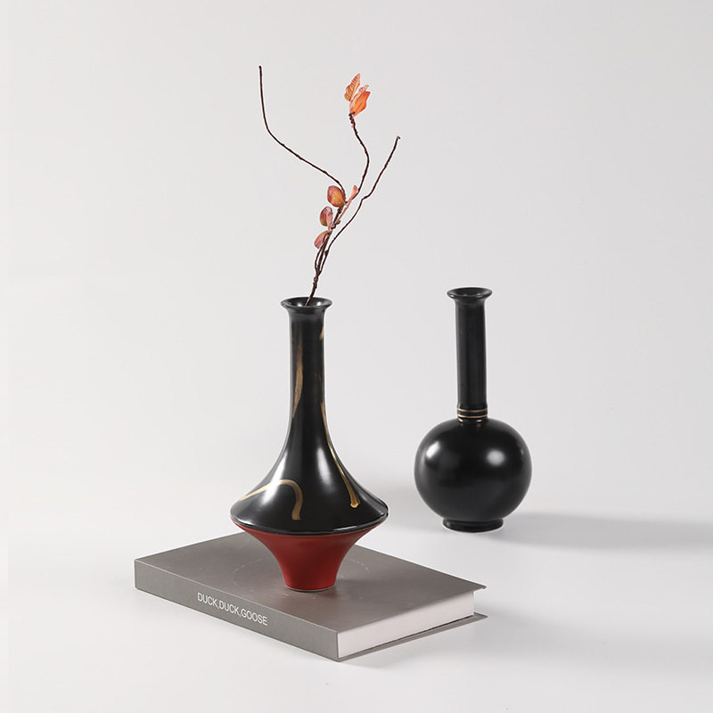 📚 新中式禅意陶瓷花瓶摆件鎏金宋代美学样板间茶桌茶台黑金花器摆件