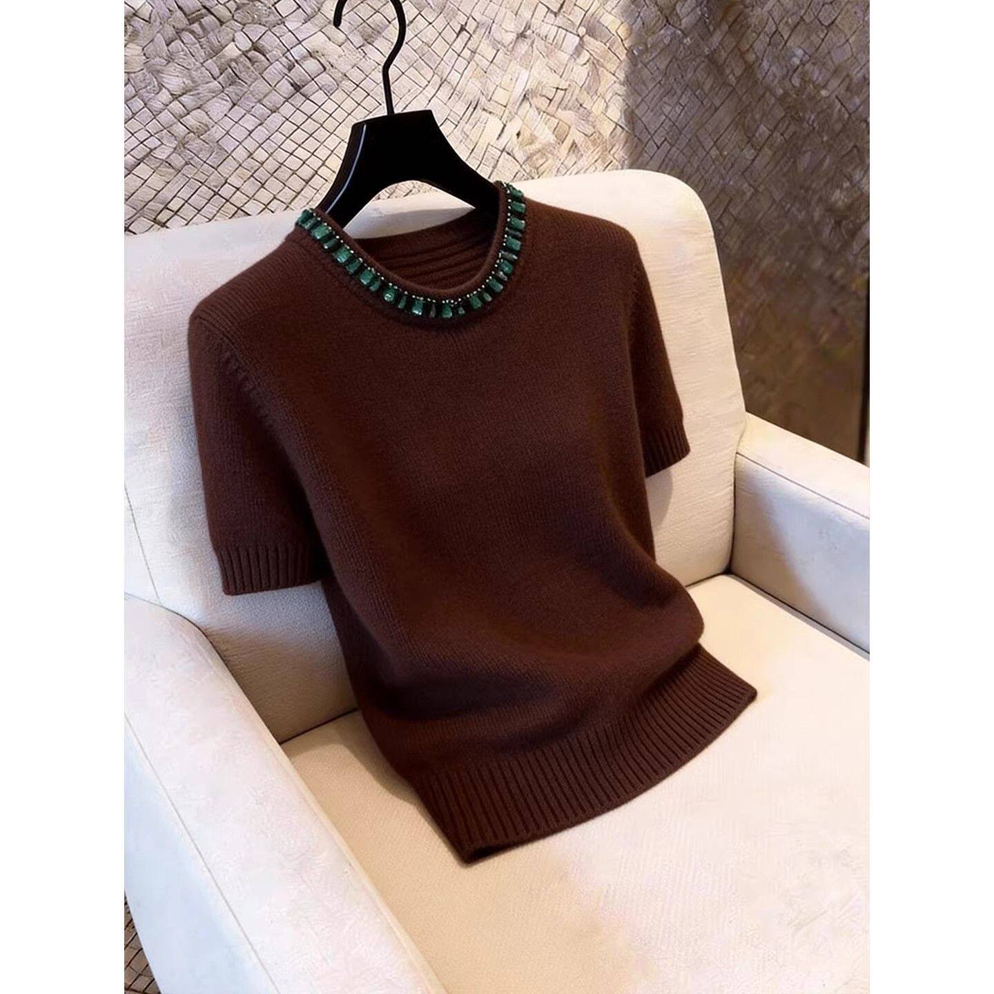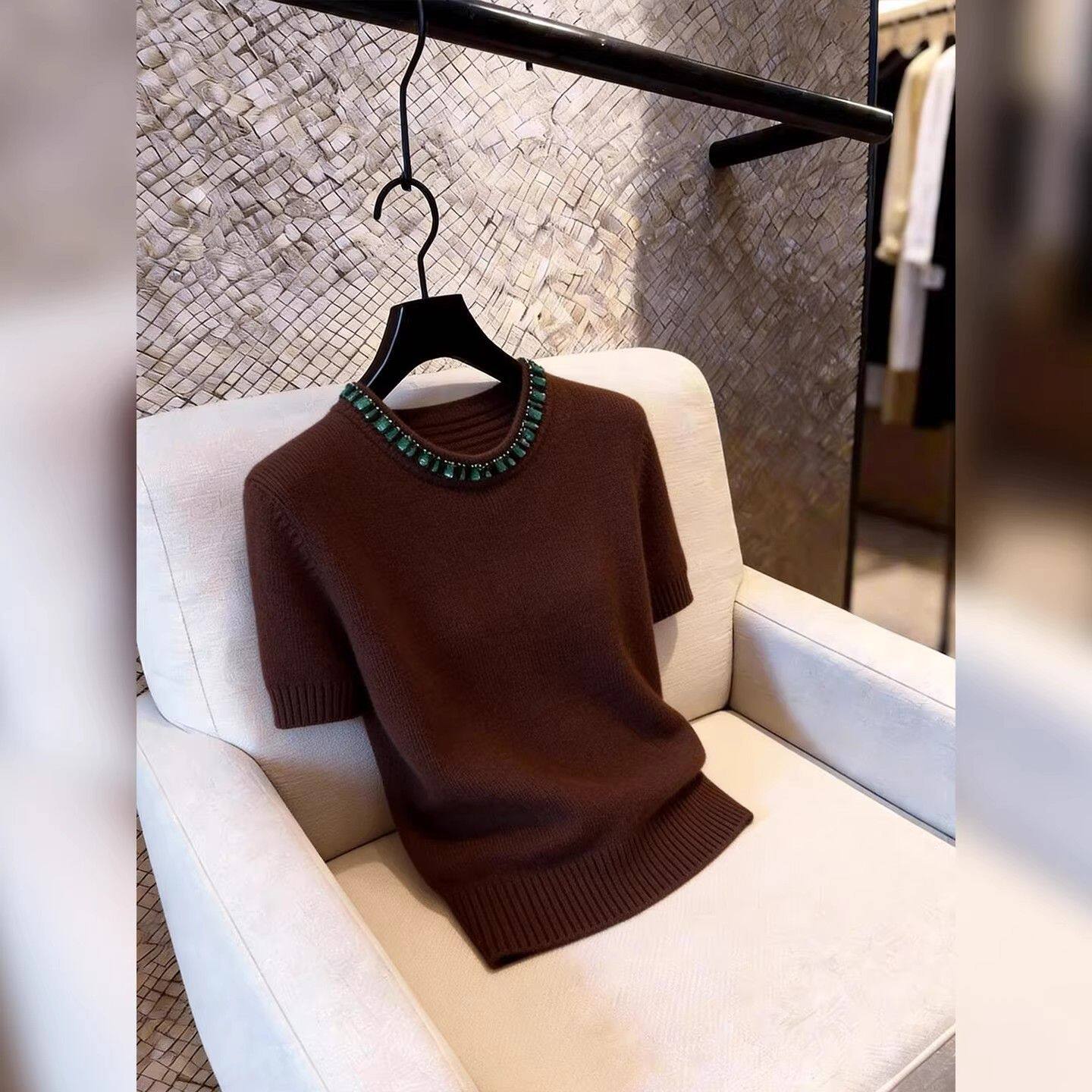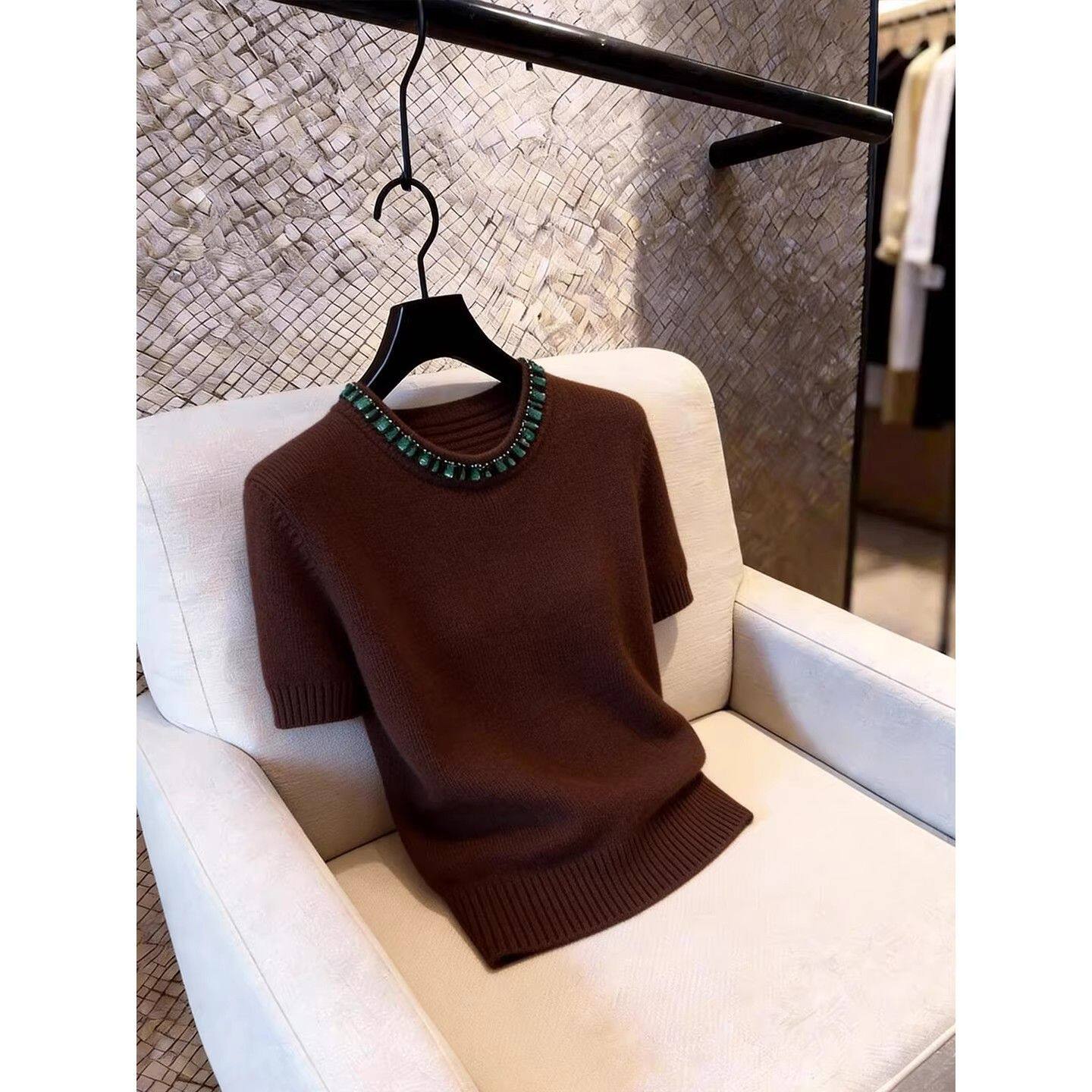 📚 复古高级感圆领针织衫轻奢烫钻上衣减龄短袖套头毛衣2026年早春女