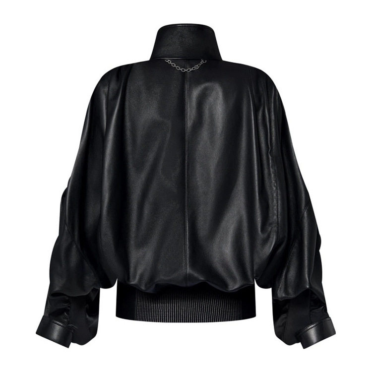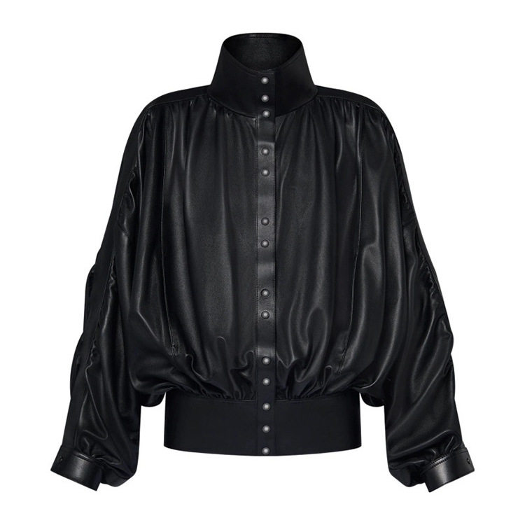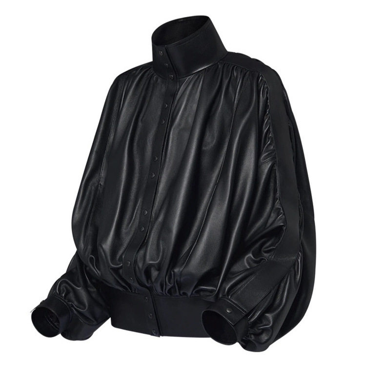 📚 真皮皮衣秋季新款立领绵羊皮重工打褶收腰长袖宽松显瘦女皮外套