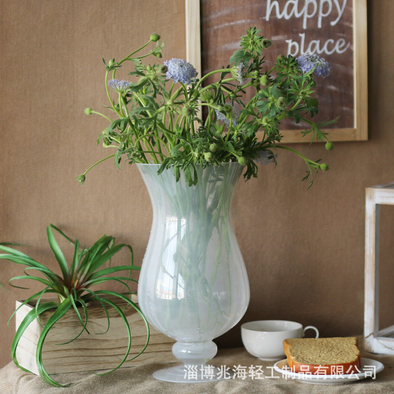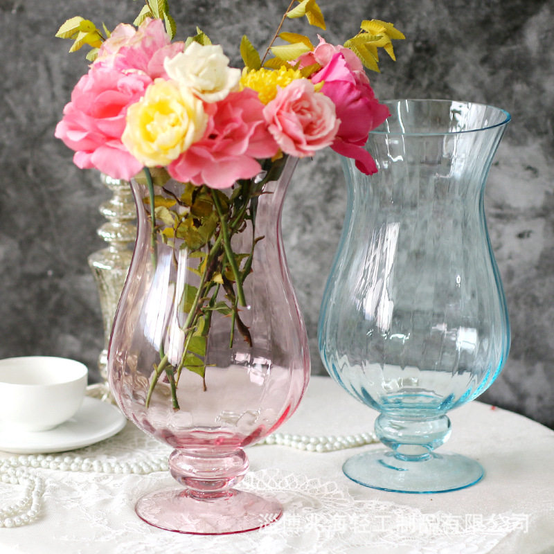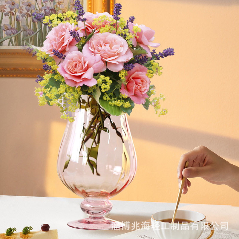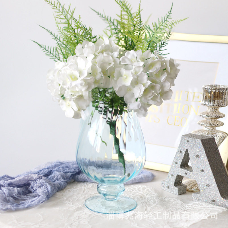 📚 法式轻奢玻璃风灯花瓶透明高脚鲜花水养绣球百合插花餐厅客厅摆件