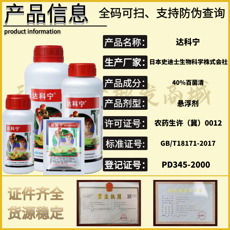 📚 日本达科宁40%百菌清 黄瓜番茄葡萄霜霉病炭疽病农药杀菌剂500g