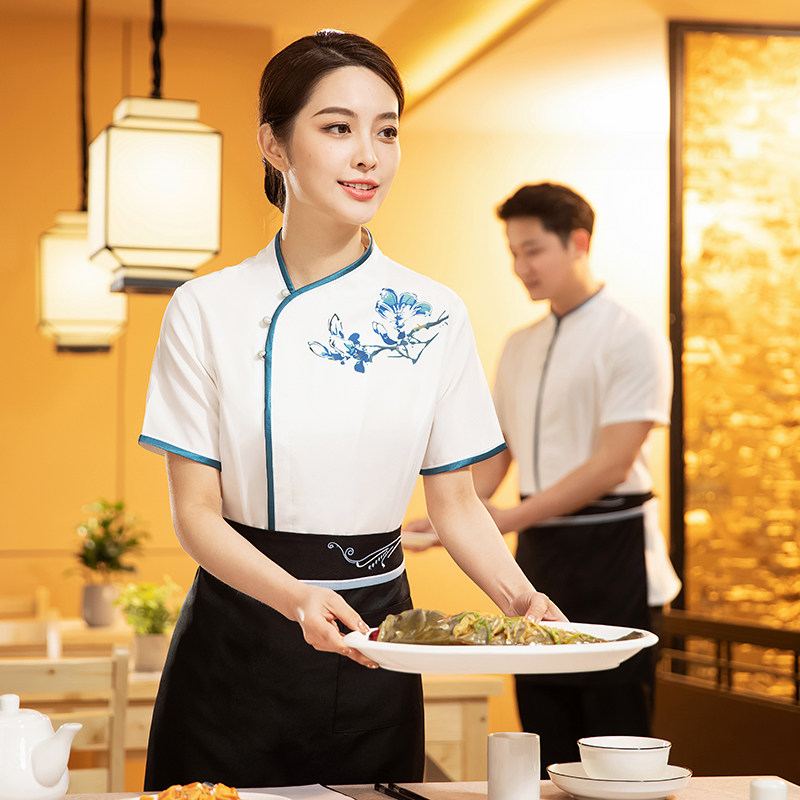 📚 中餐店服务员工作服夏装中式餐厅酒店餐饮火锅饭店工服白色女短袖