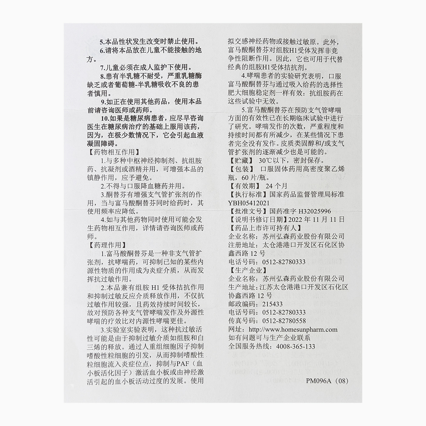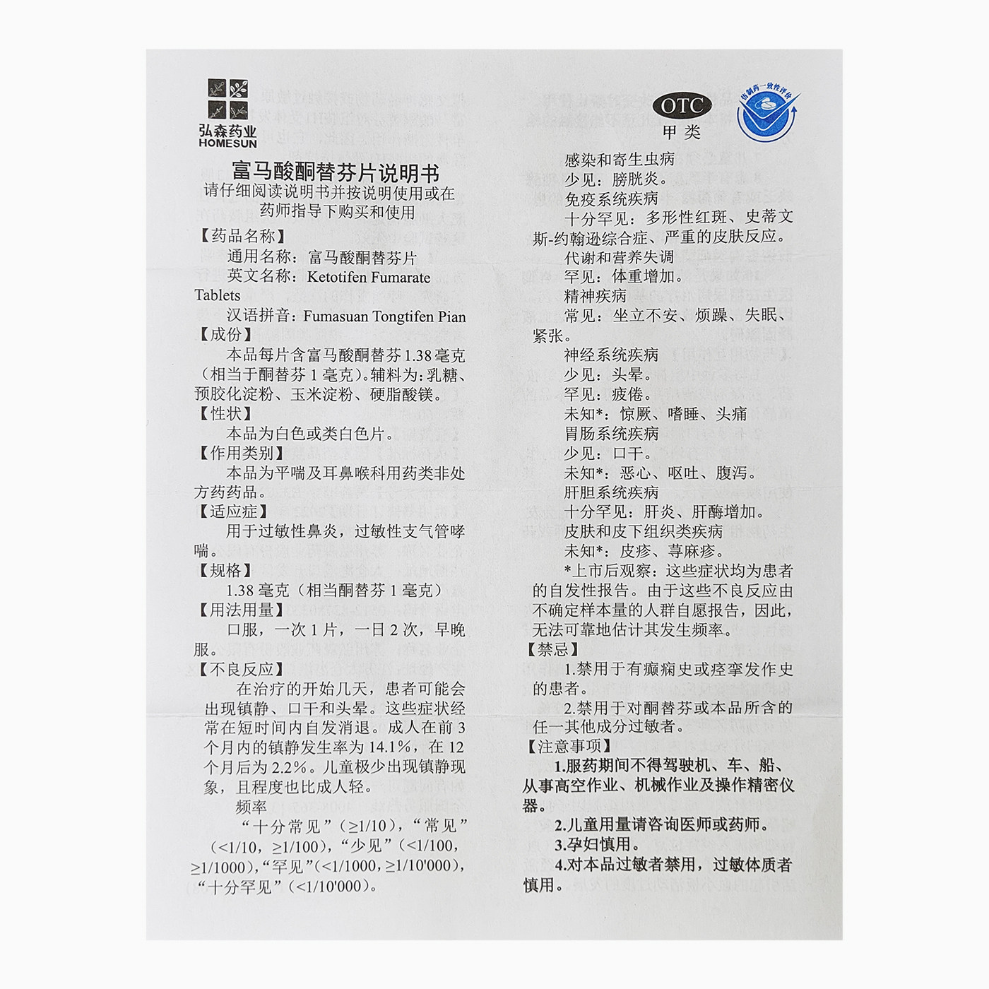 📚 弘森药业 富马酸酮替芬片60片 过敏性鼻炎过敏性支气管哮喘