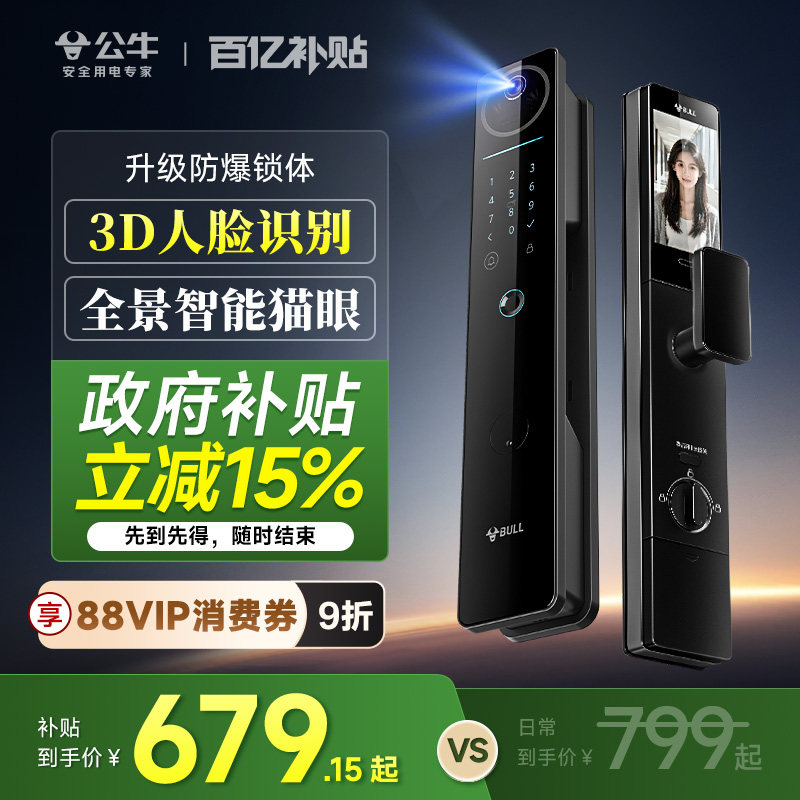 69¥ CZ005 sFIe5SGZlet¥ https://m.tb.cn/h.irxxHmV 公牛智能门锁全自动指纹锁家用防盗门人脸识别智能锁密码锁电子锁 --------------------- 【原售价】3,999元 【现售价】1,799元。