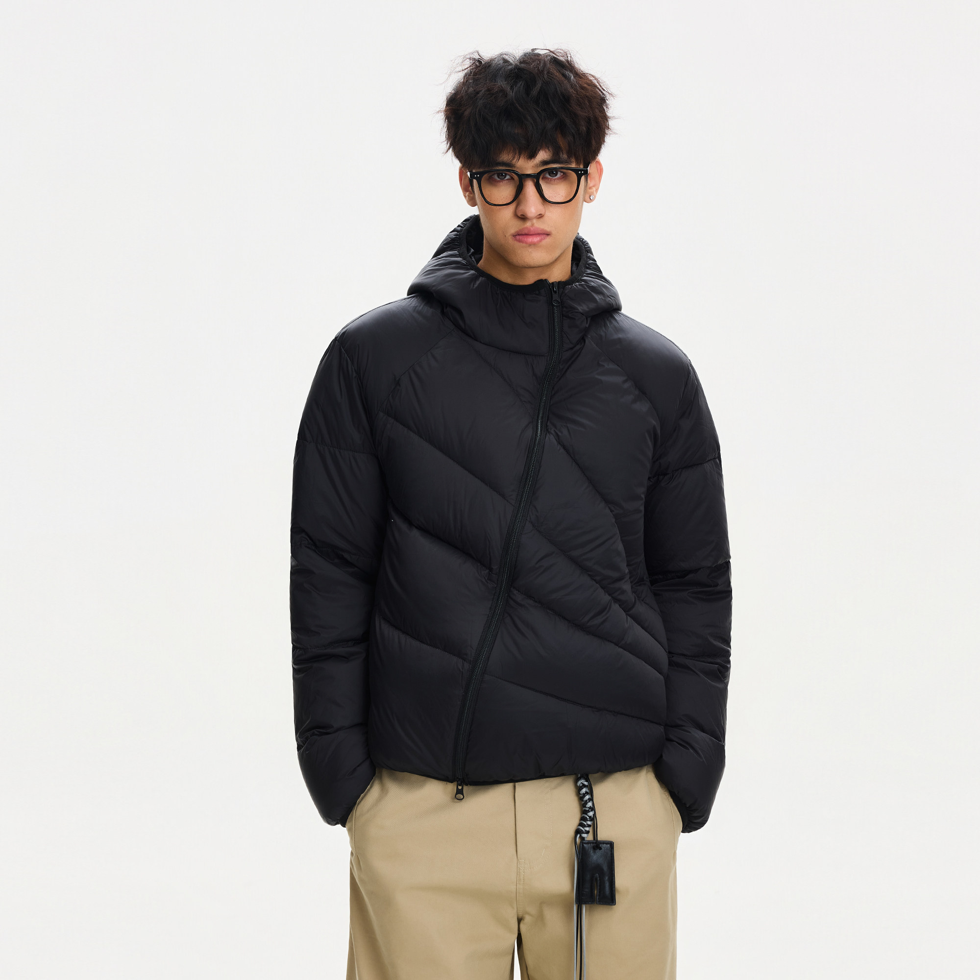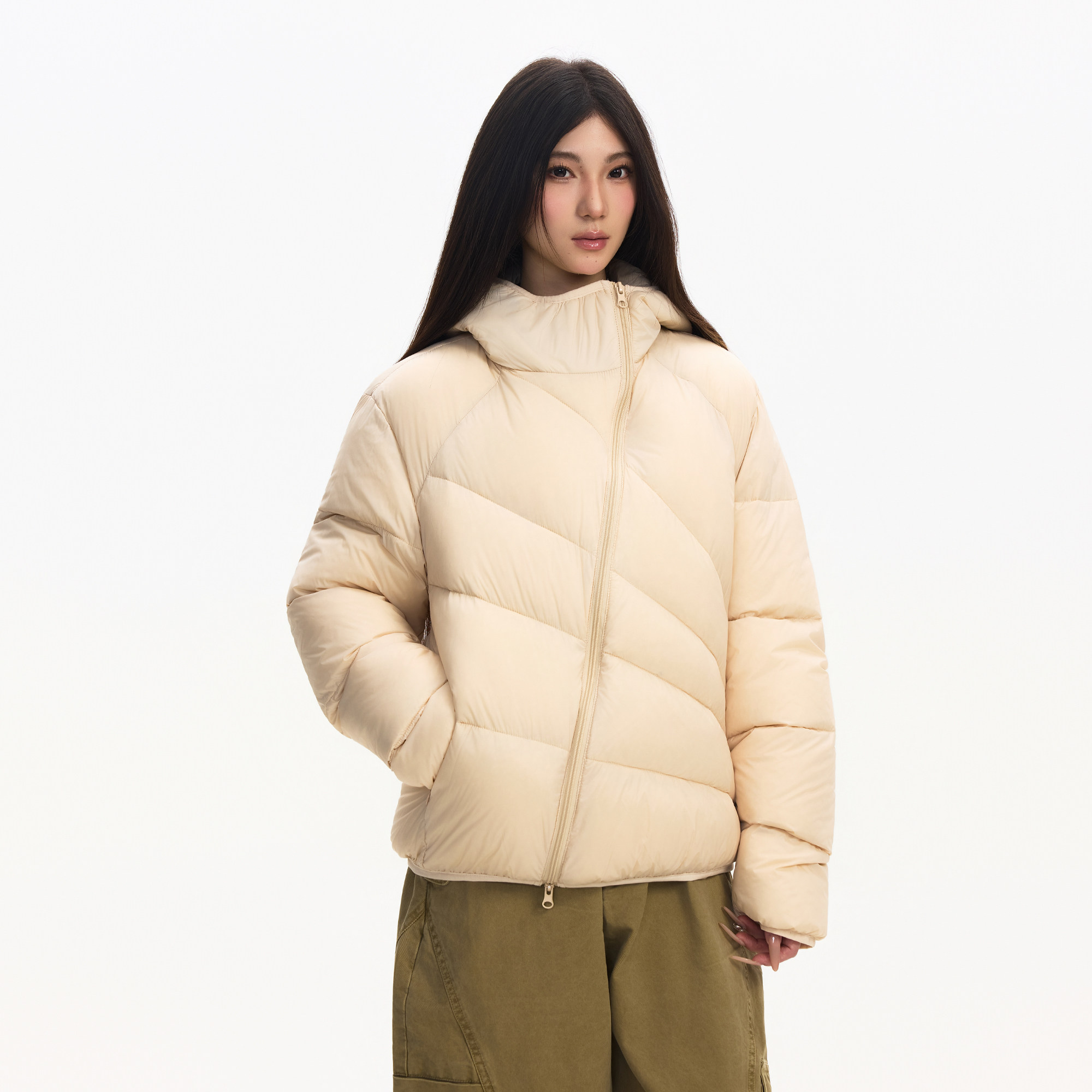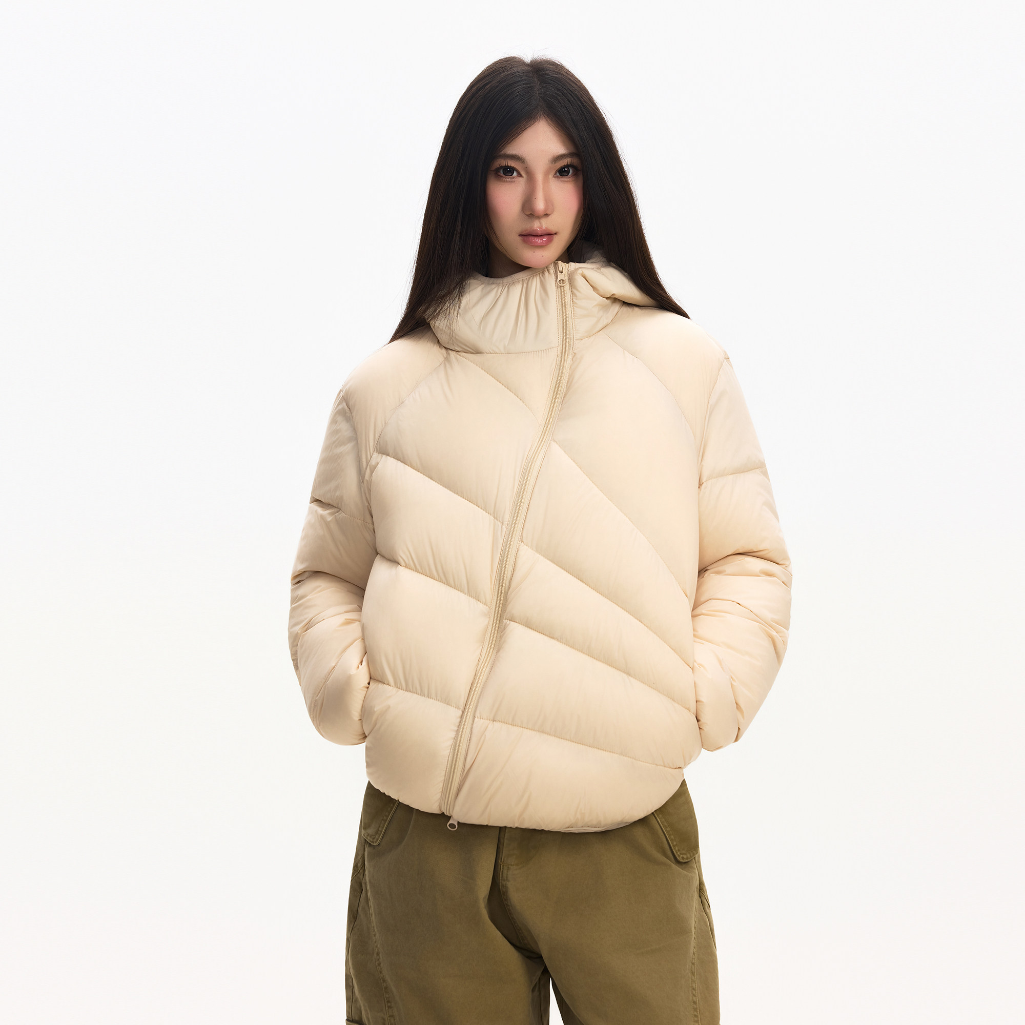 📚 Syri放射线拼接解构90排骨斜拉链羽绒服轻便连帽正肩防水羽绒外套