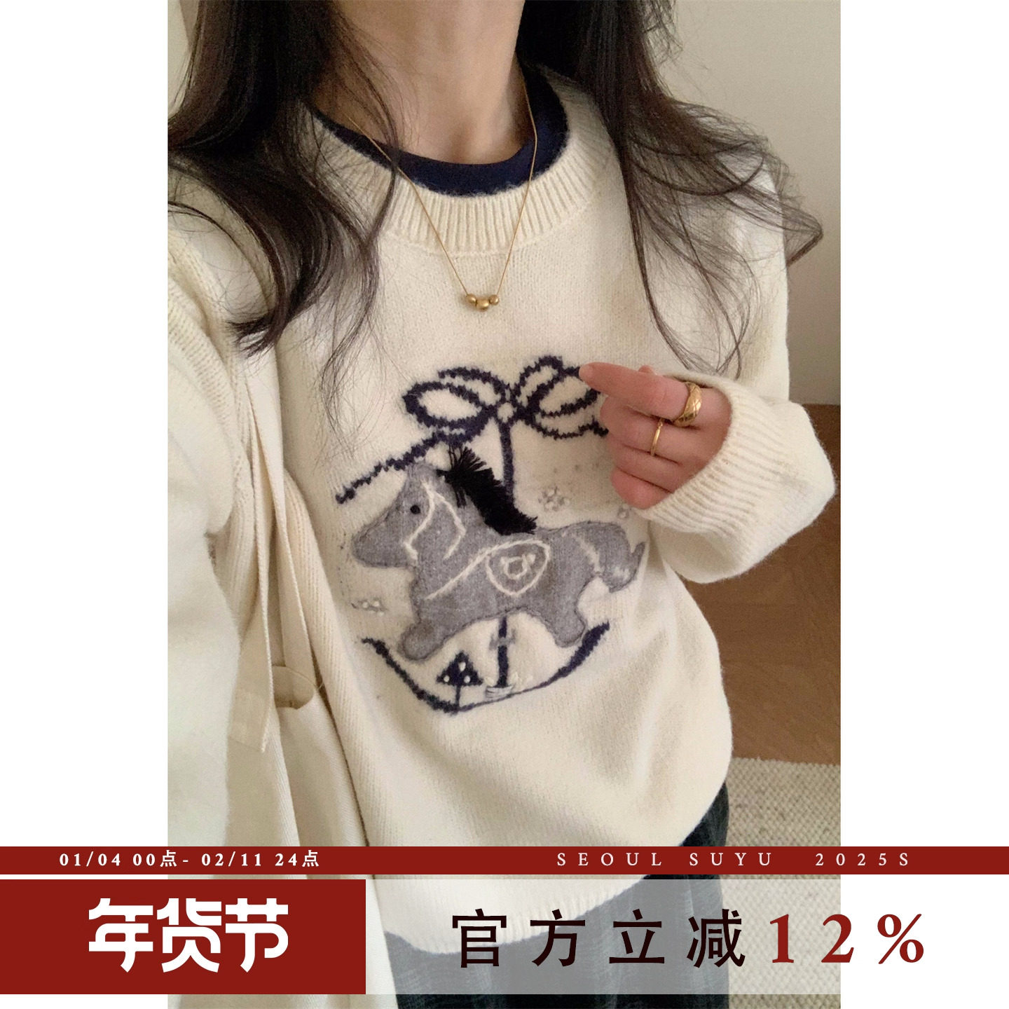 📚 韩系休闲减龄小马印花毛衣女2026春季新款宽松显瘦软糯百搭上衣