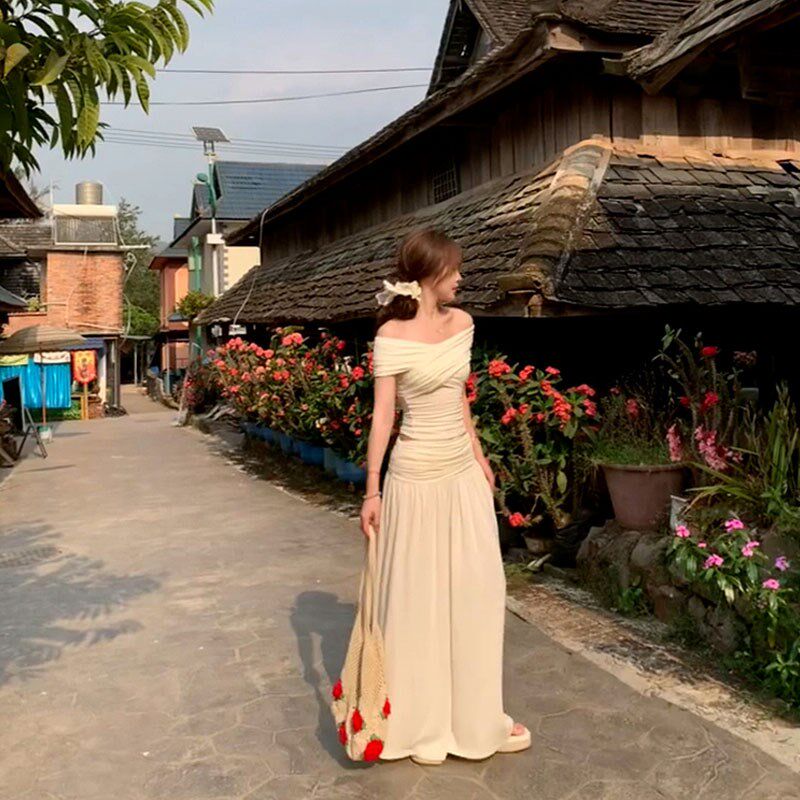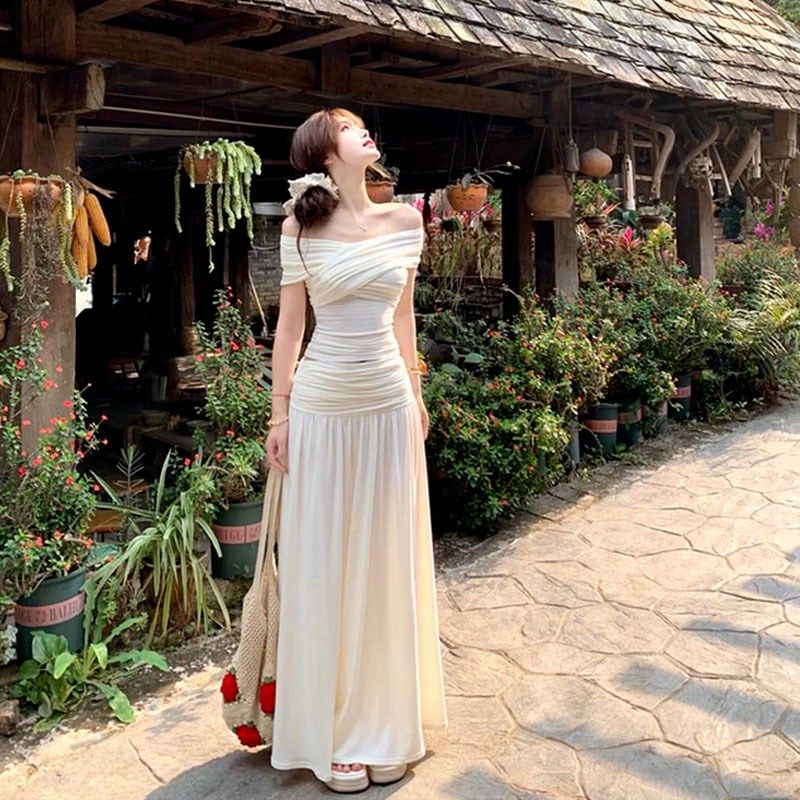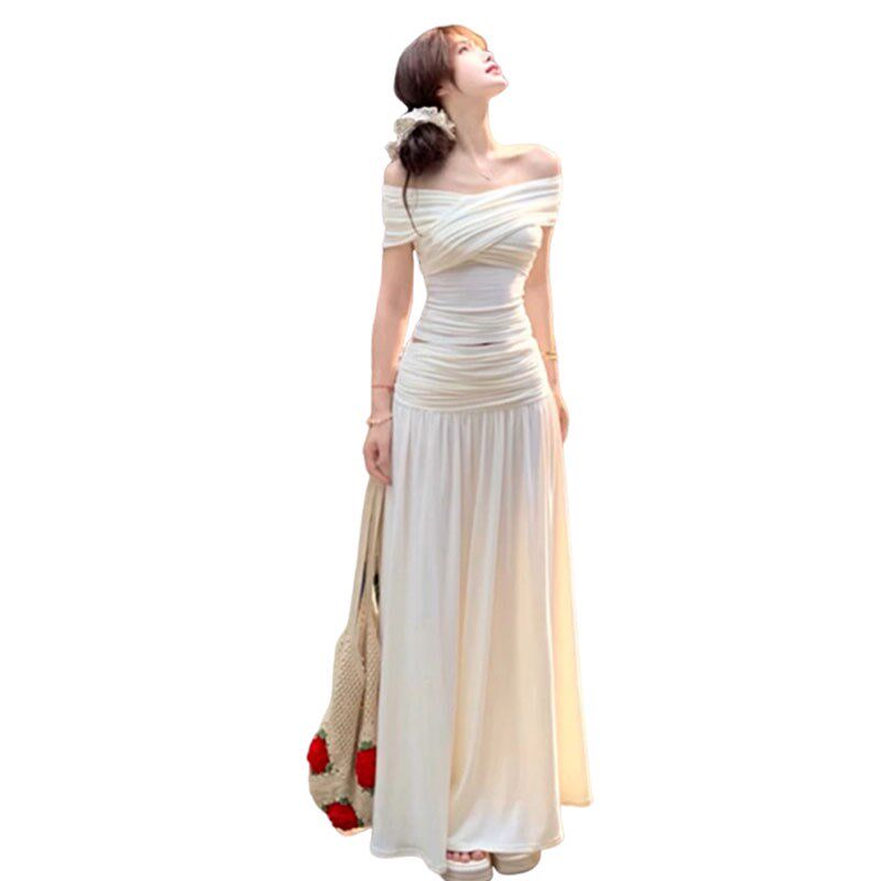 📚 法式白色一字肩连衣裙子女夏2025年新款开春穿搭气质收腰长裙套装