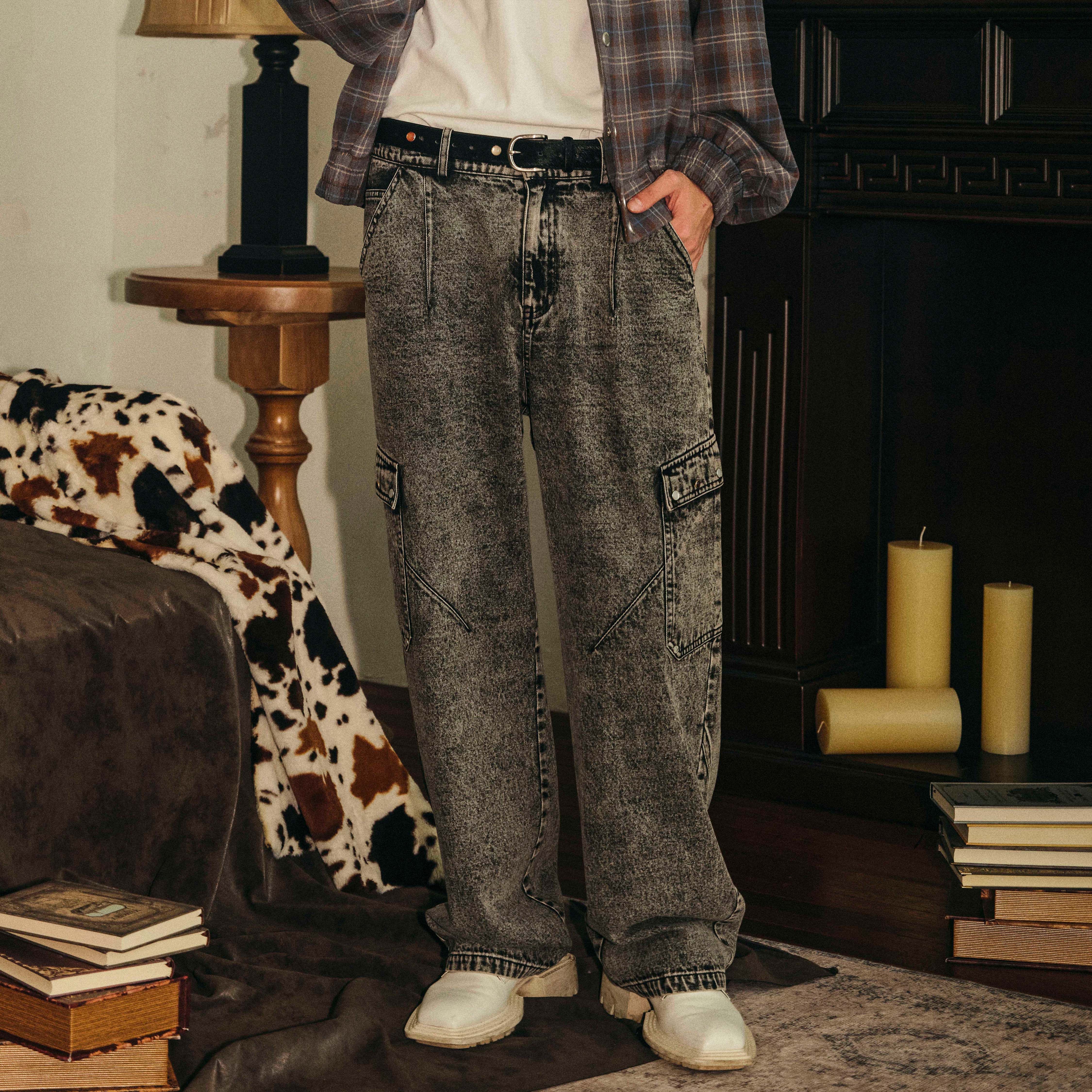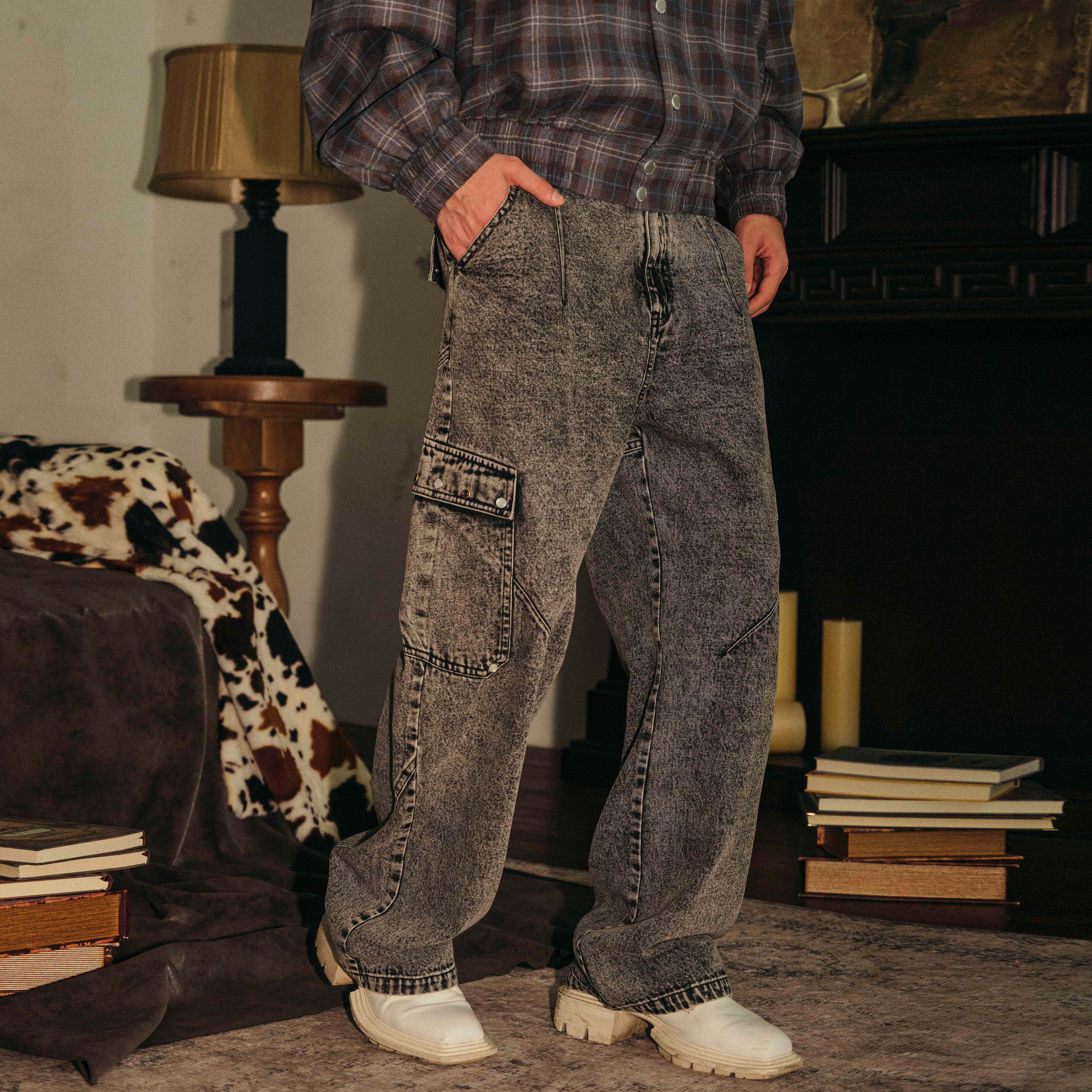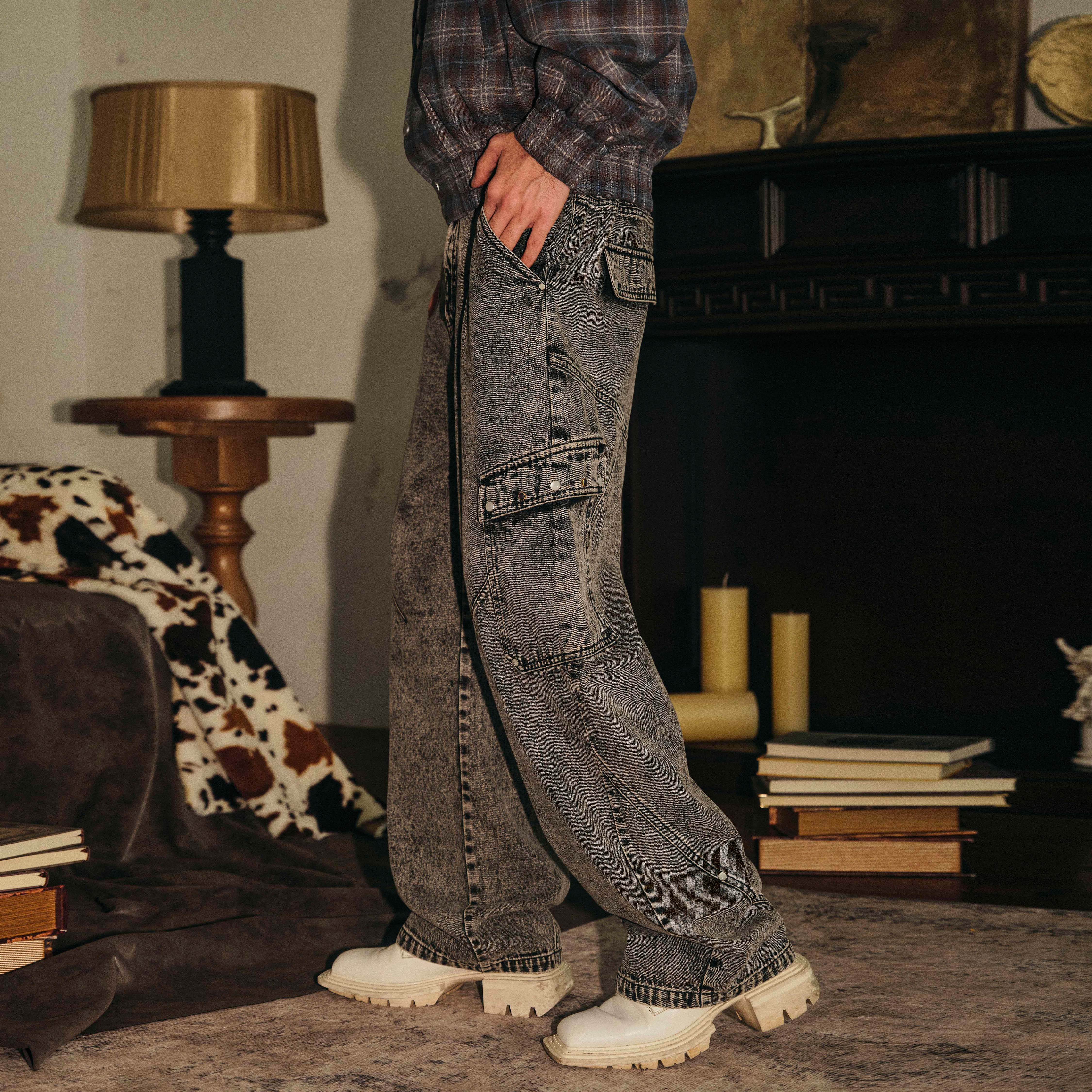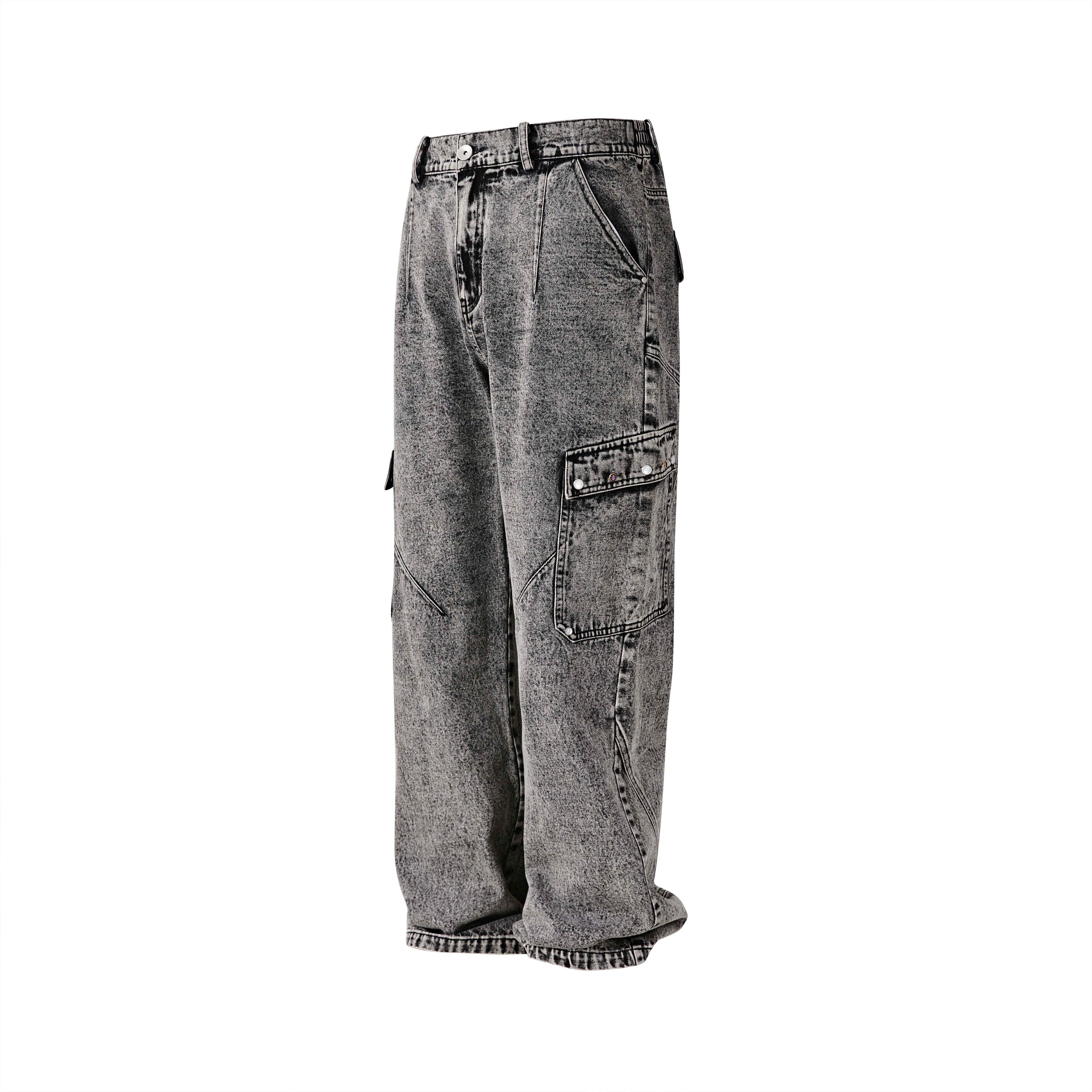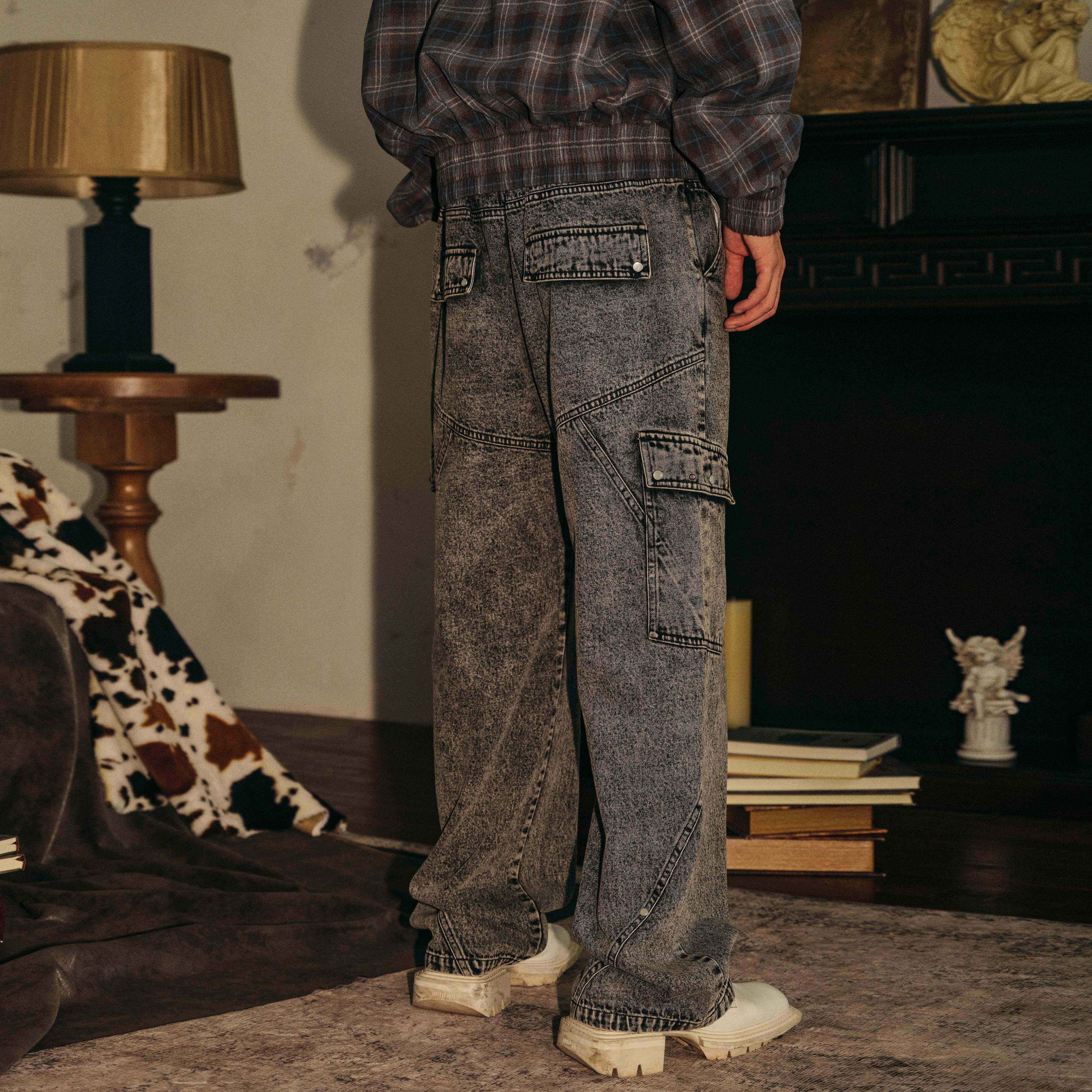 📚 PASET美式复古灰色水洗做旧牛仔裤男宽松直筒工装口袋休闲长裤子