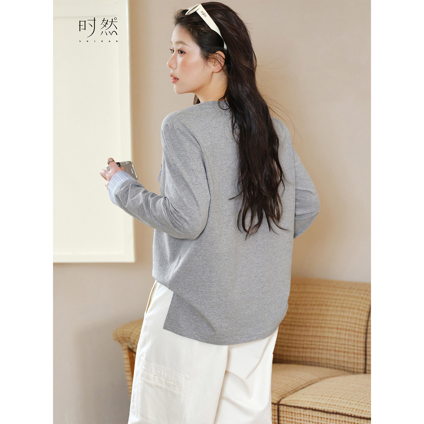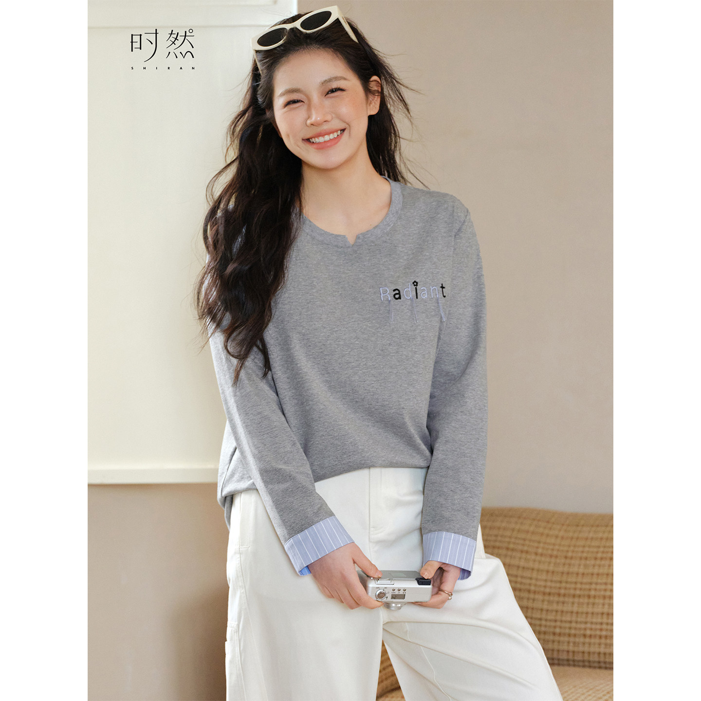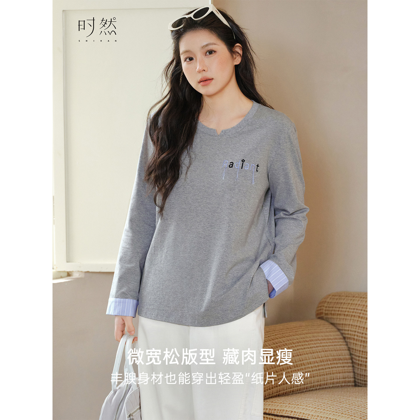 📚 时然大码假两件刺绣T恤微胖mm春季女装上衣灰色圆领宽松韩版新品