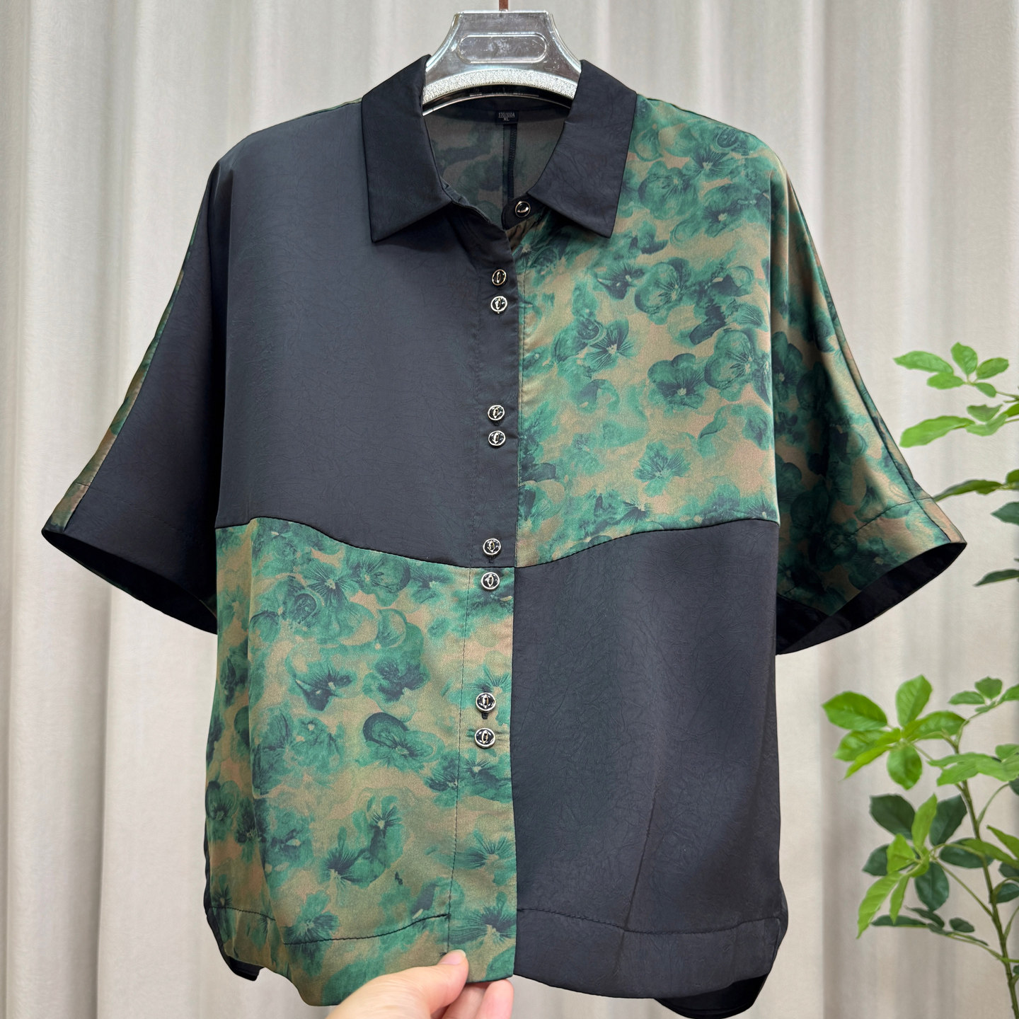 📚 中老年女装高贵衬衫妈妈装宽松遮肉开衫短袖上衣老年人蝙蝠袖衬衣