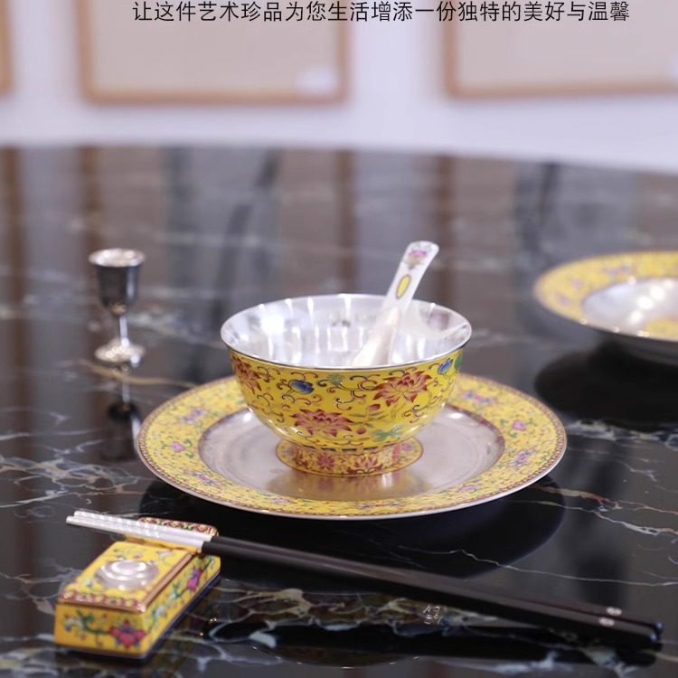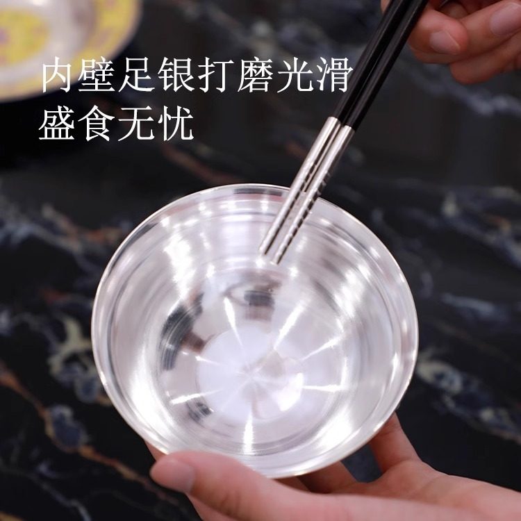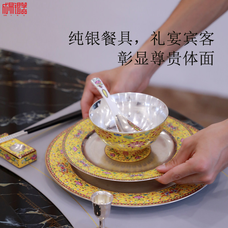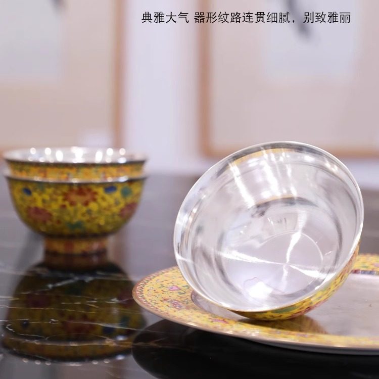 📚 成易银器 999纯银碗实心内胆中式传统珐琅彩足银食品接触级家用