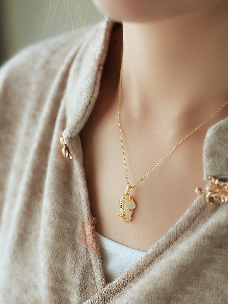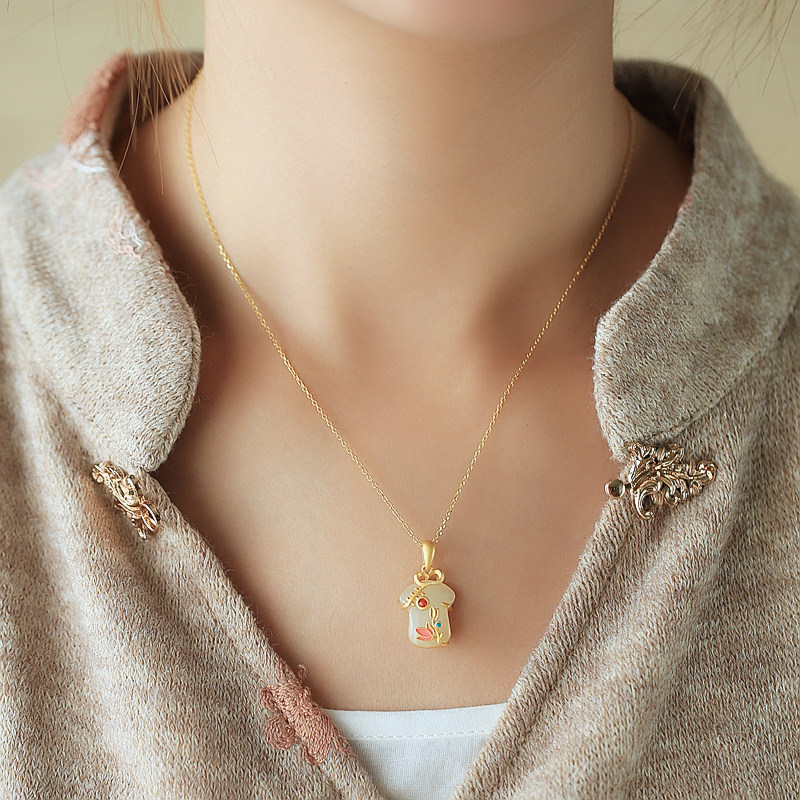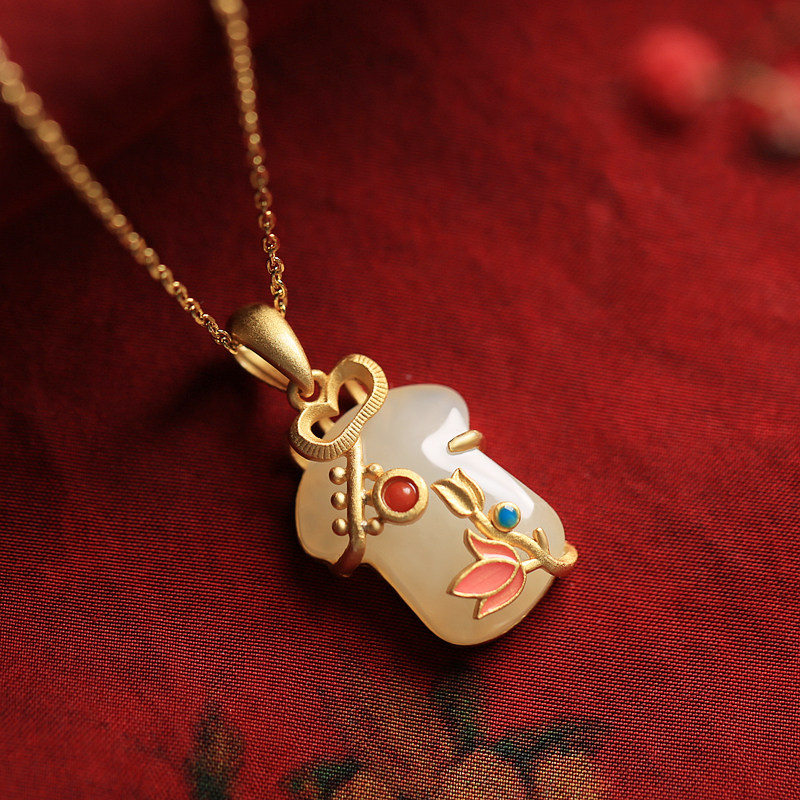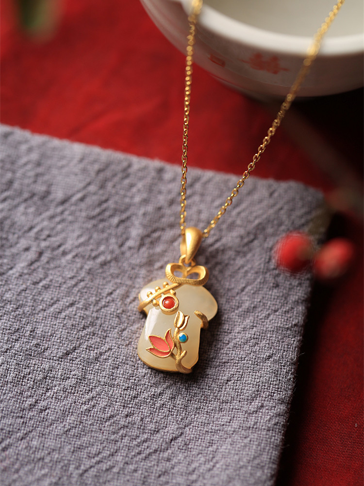 📚 小银匠天然和田玉纯银锦衣玉食吊坠女中式国风玉石金镶玉旗袍项链