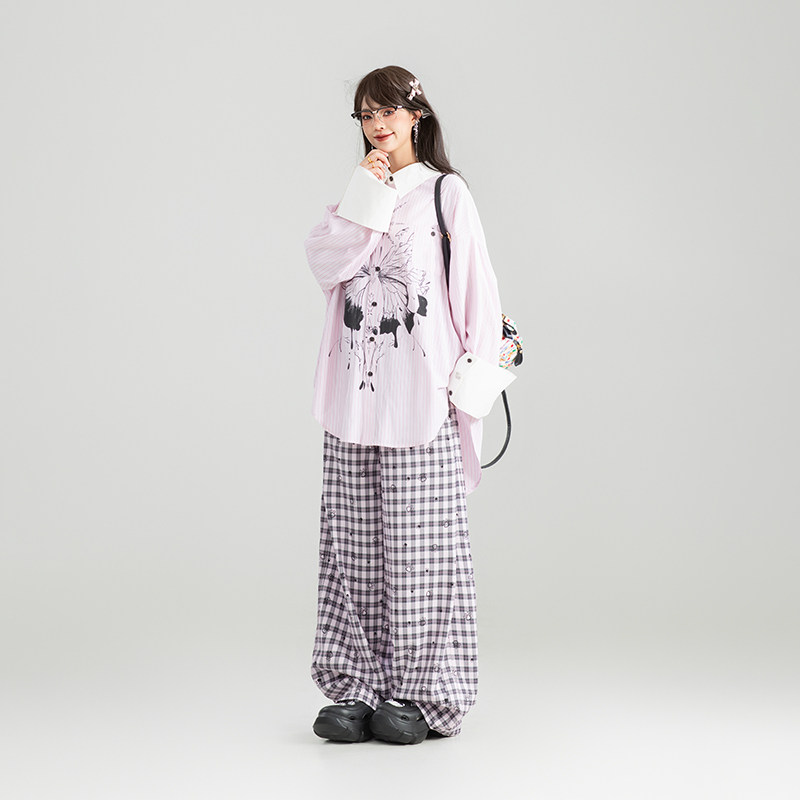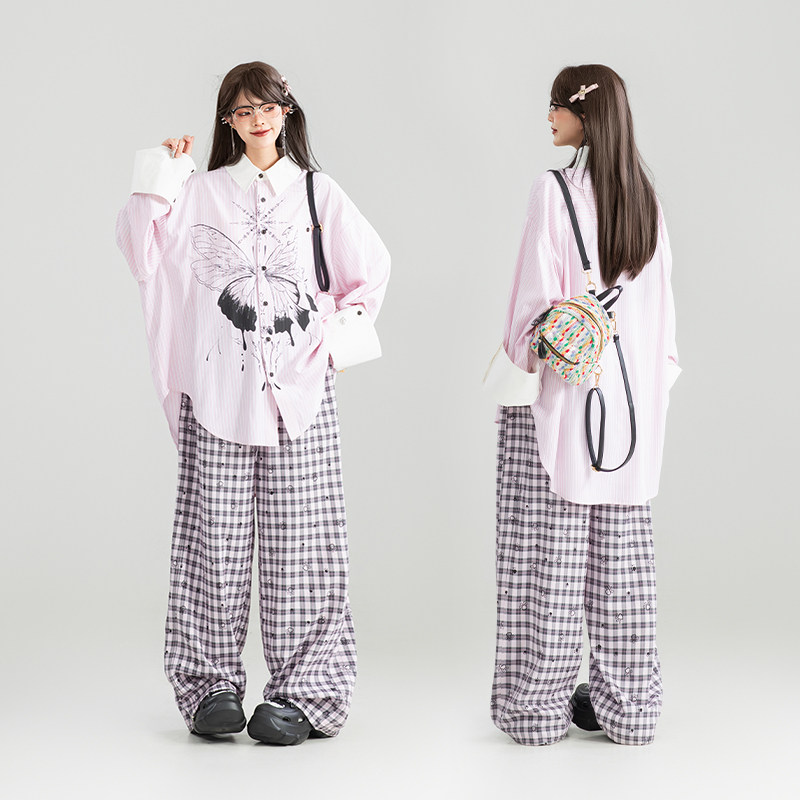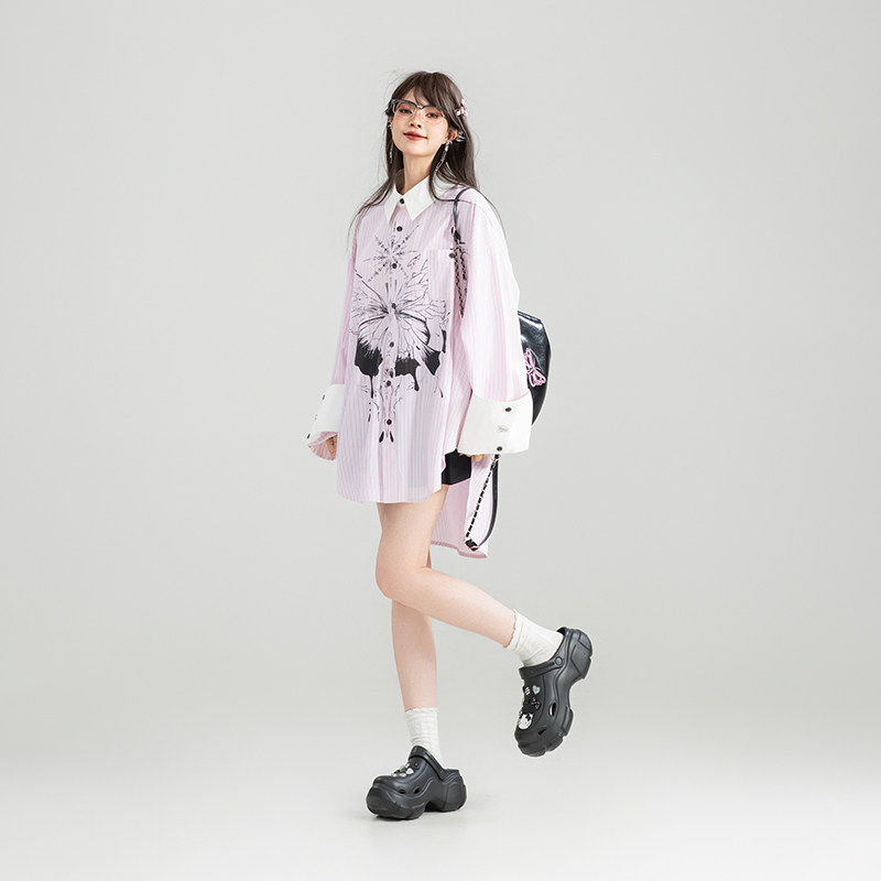 📚 KEIKO 蝴蝶印花粉色燕尾衬衫女26春季设计感撞色翻折宽松条纹上衣