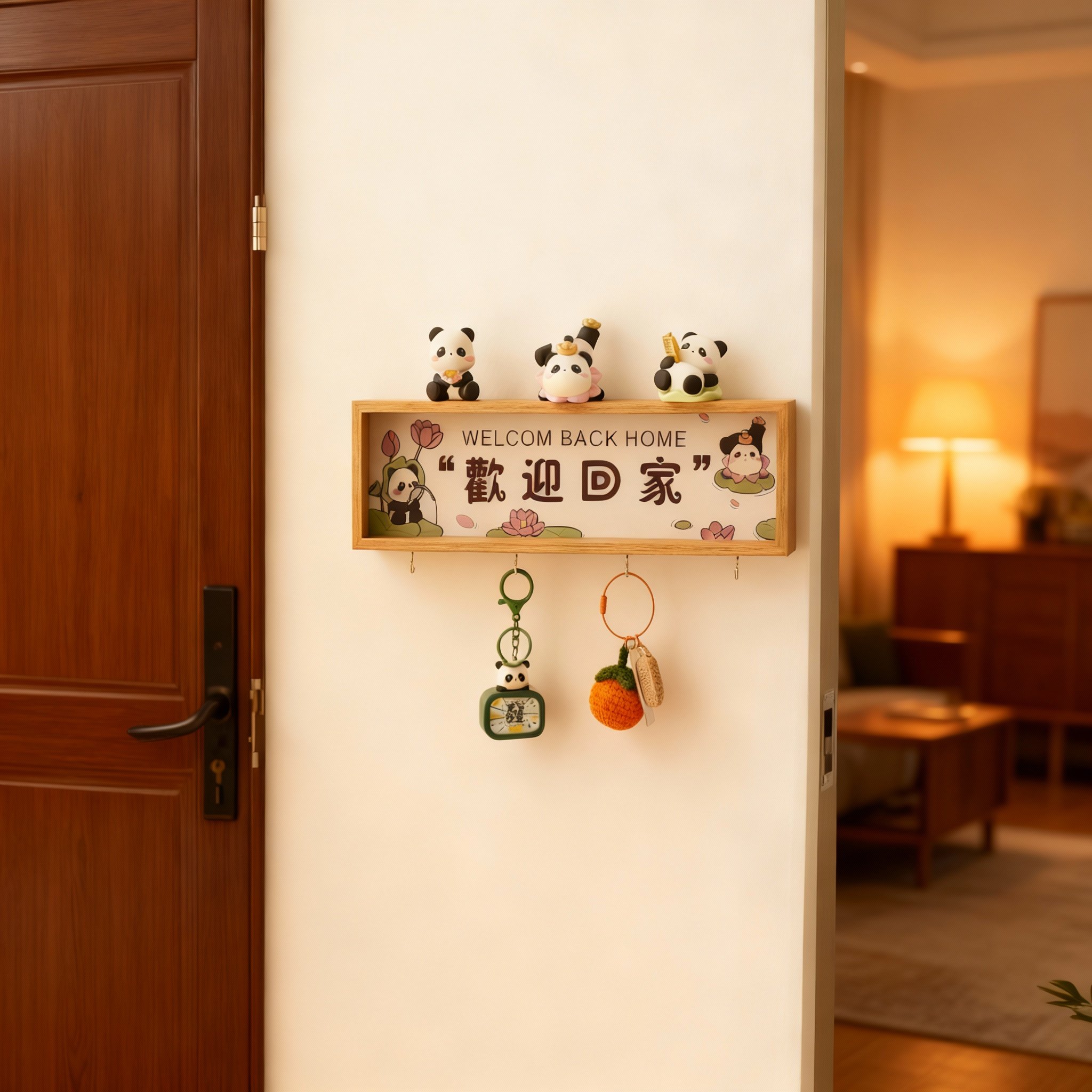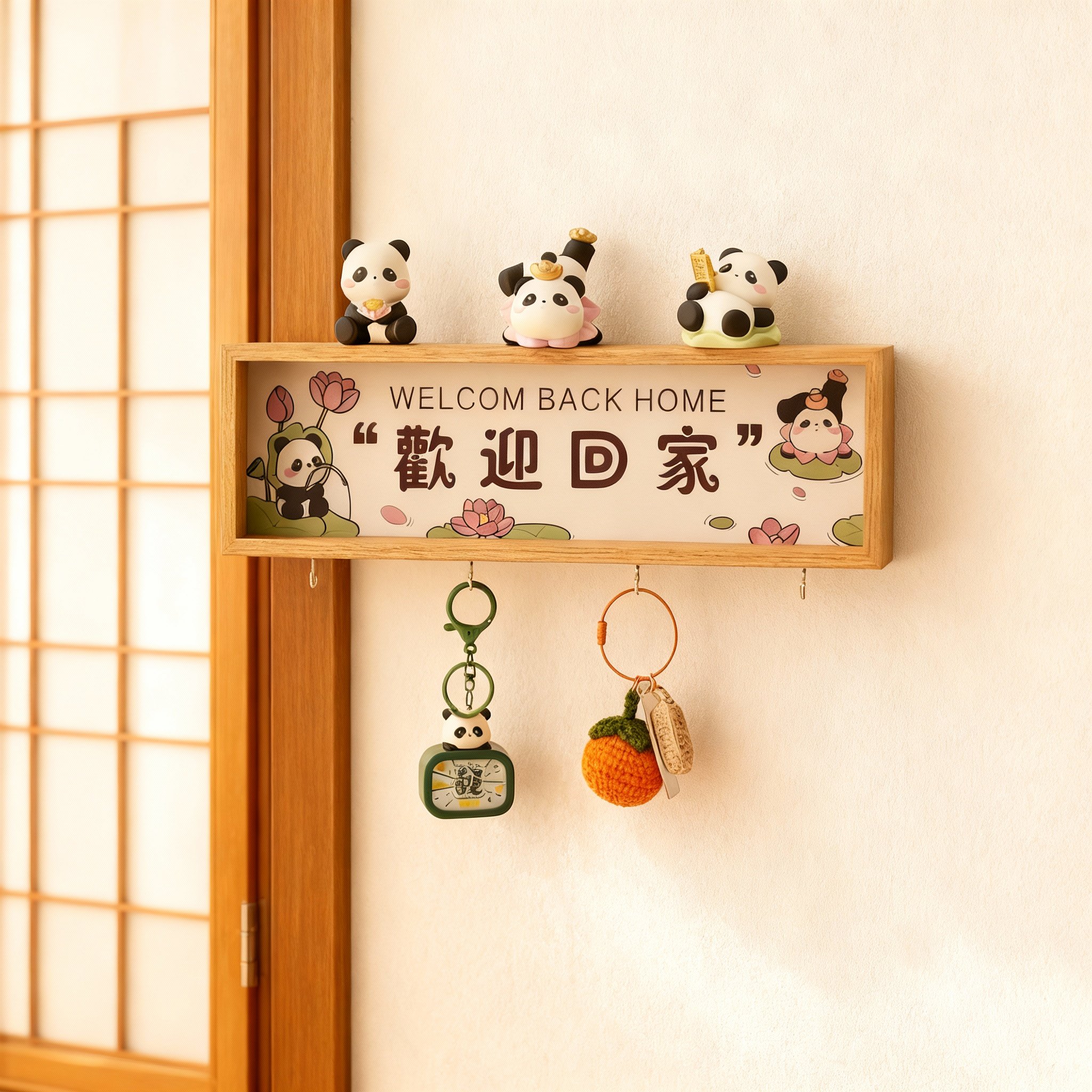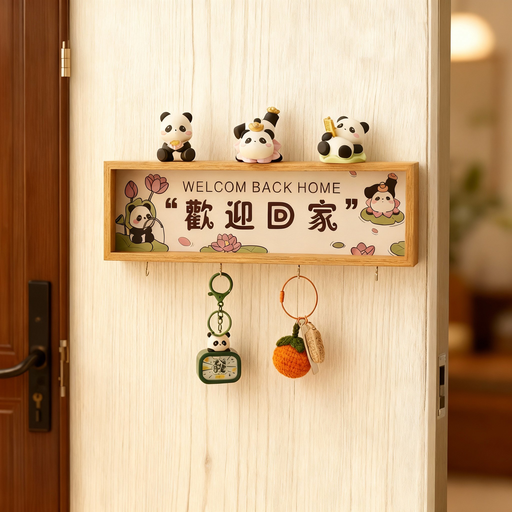 📚 卡通熊猫钥匙挂钩木质收纳架门后装饰置物架可爱家居挂件