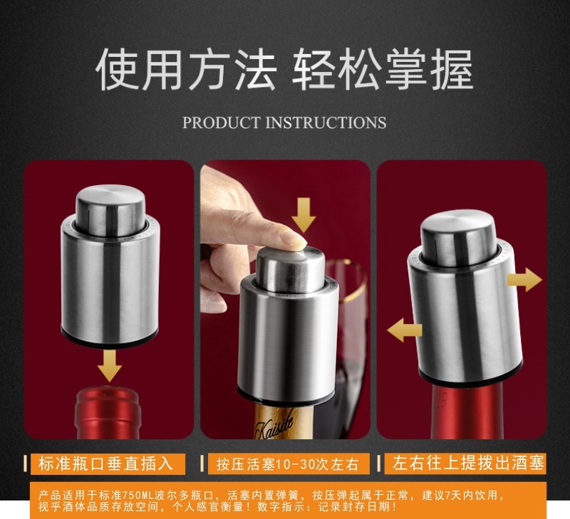 📚 红酒葡萄酒真空按压密封排气保鲜瓶塞酒盖不锈钢硅胶酒帽日期记