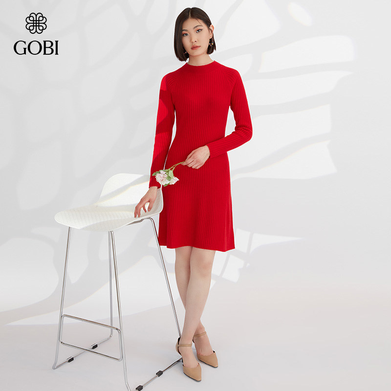 📚 GOBI戈壁春秋休闲修身中长款山羊绒女士长袖针织连衣裙长裙WK502