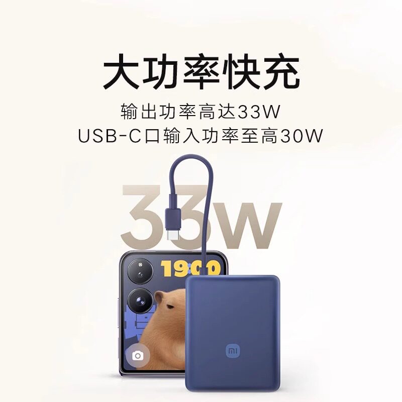📚 小米自带线充电宝10000mAh 33W户外便携小巧超薄双向快充移动电源