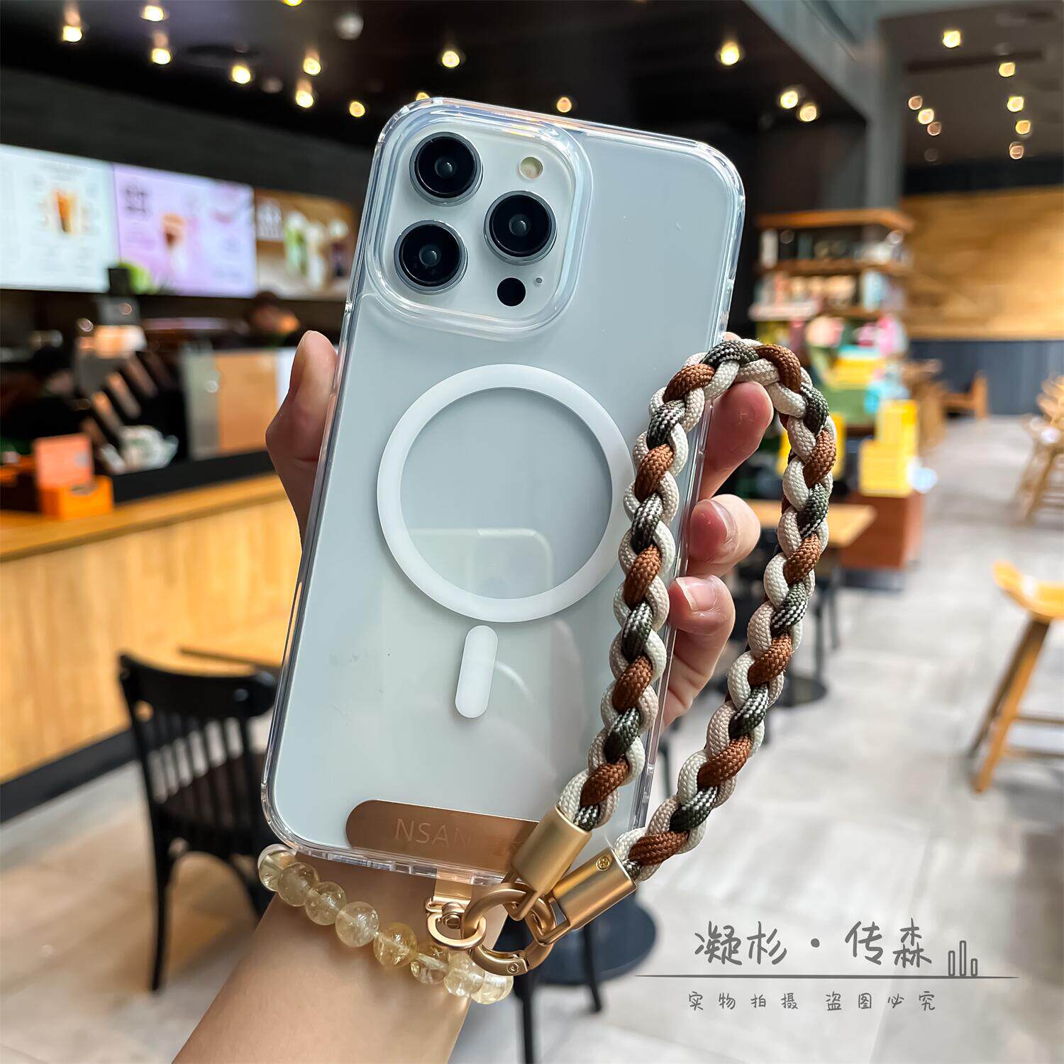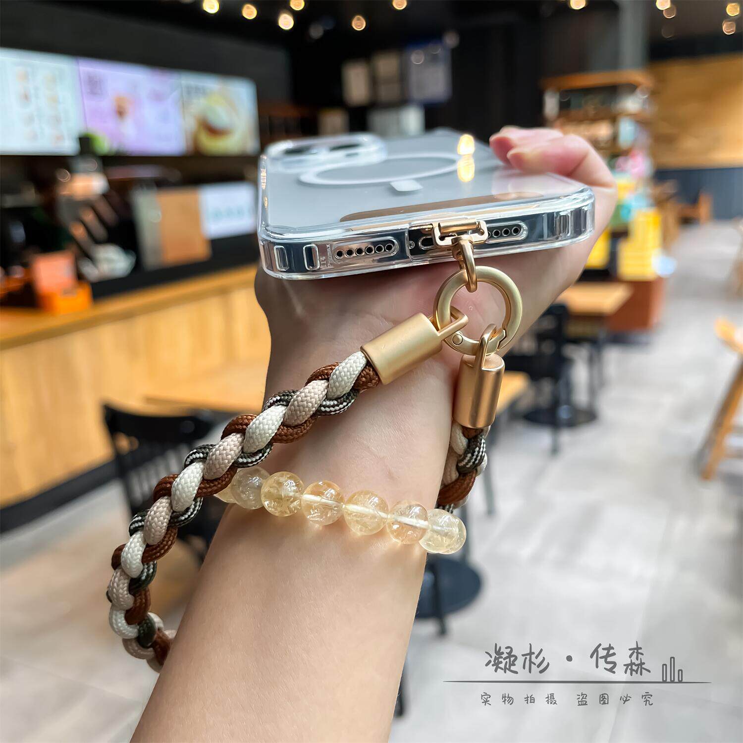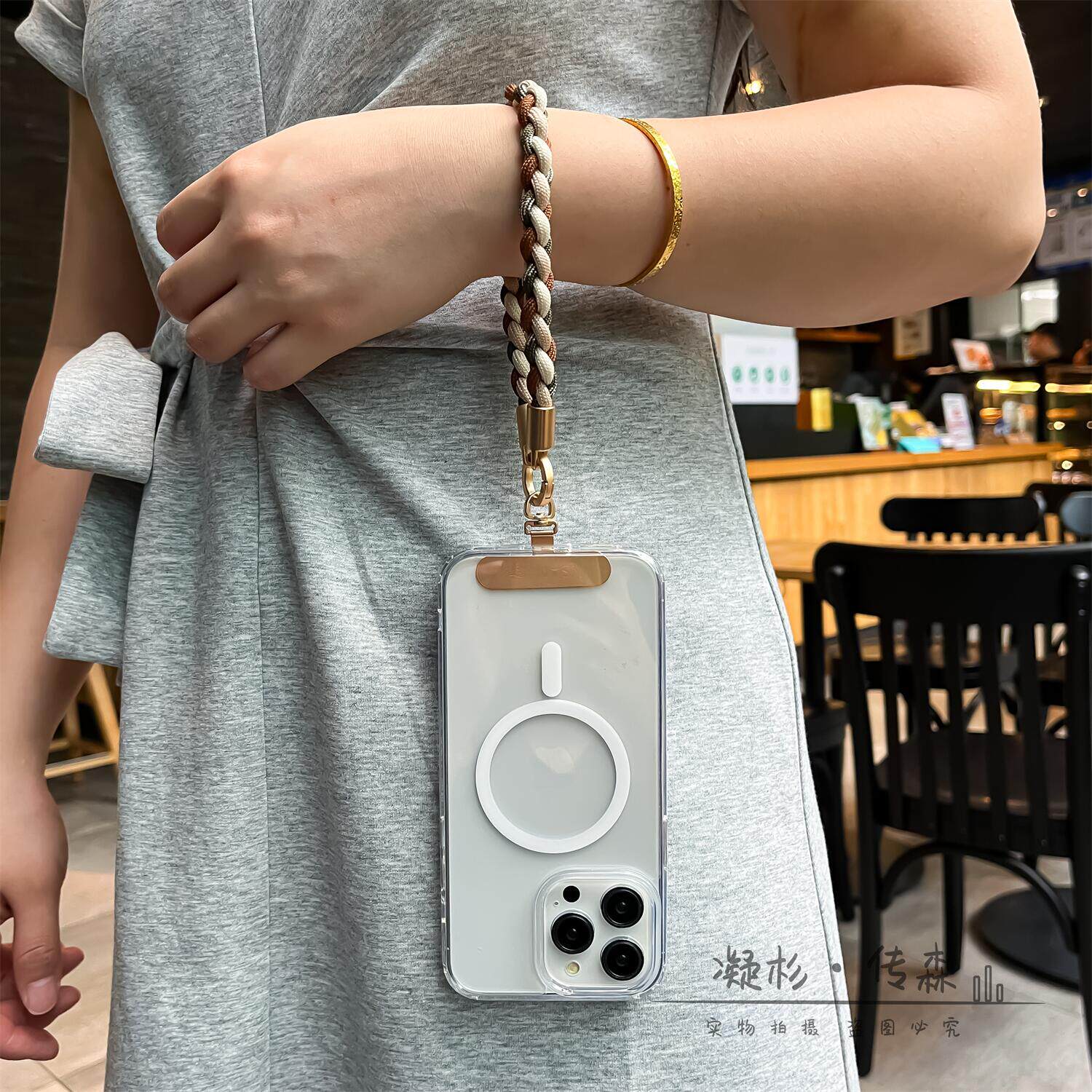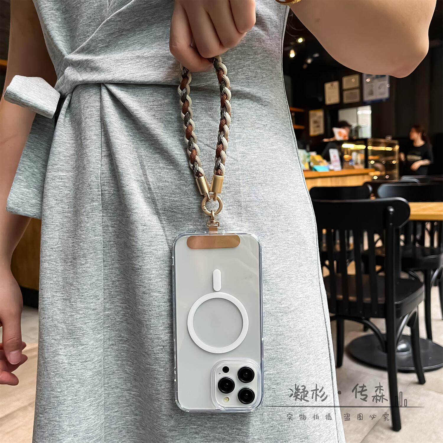 📚 高端美拉德风棕色秋冬款四股编织手腕绳短款手机挂绳双头可手提防丢手绳挂件腕带金属夹片挂饰新女款包带结实