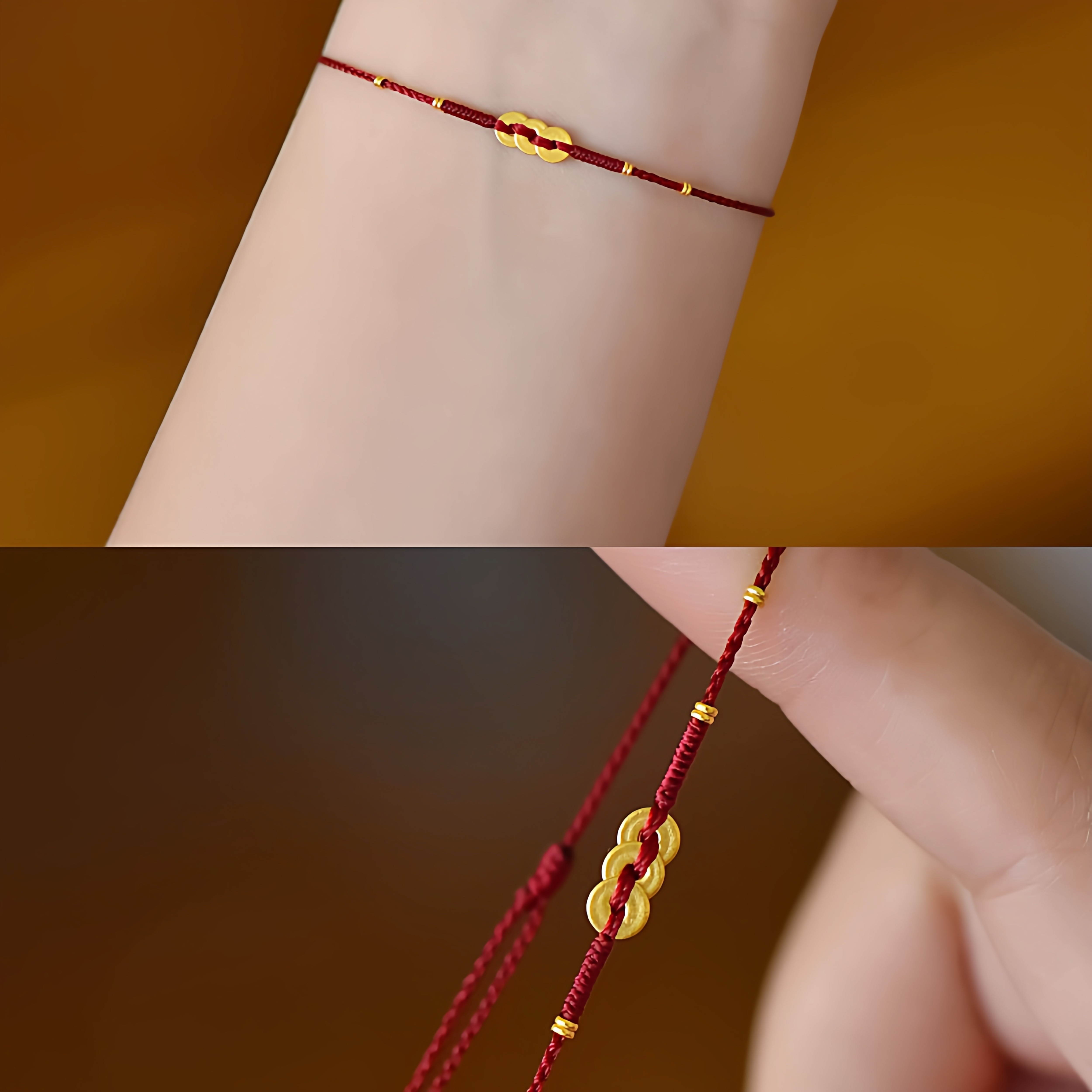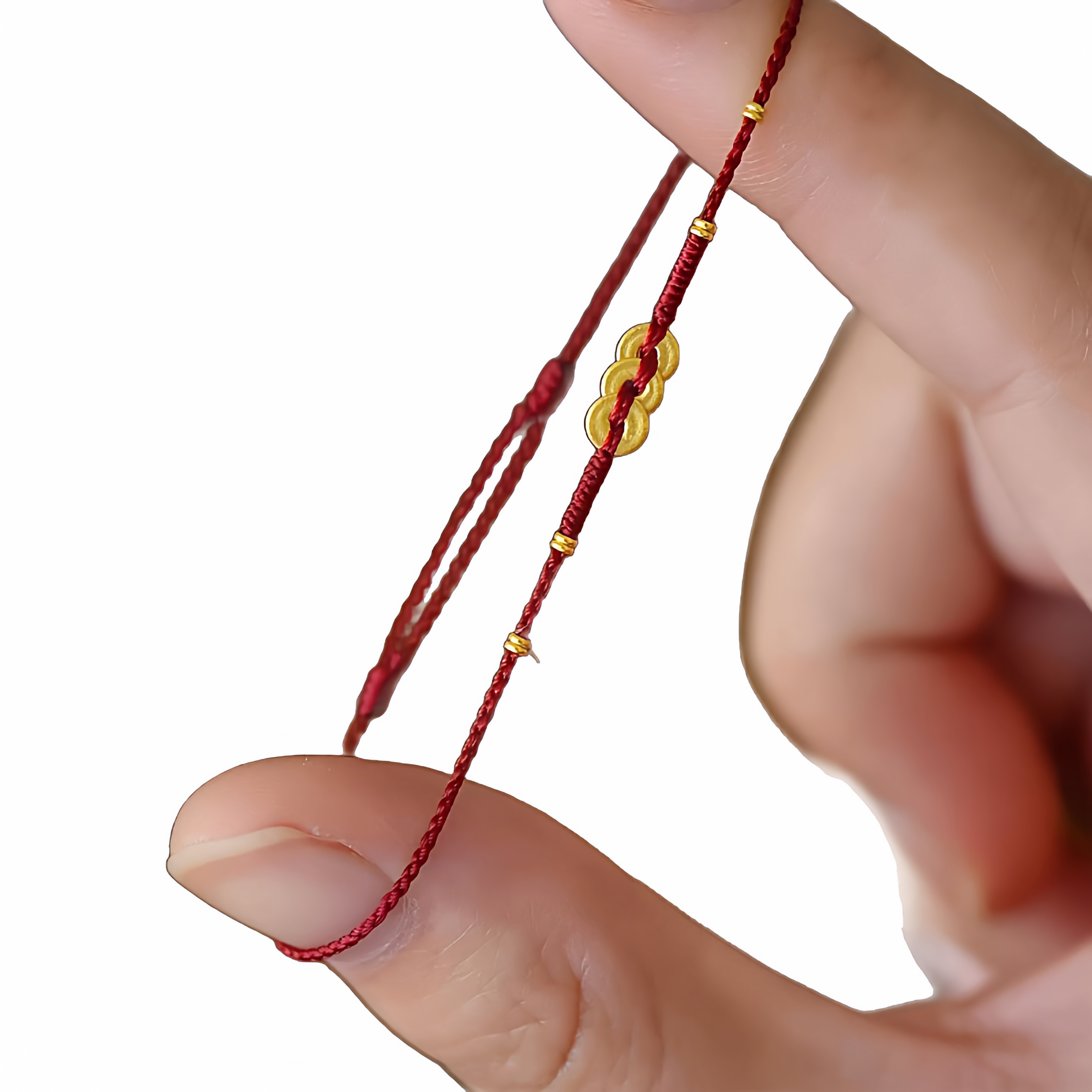 📚 极细钱币红绳手链女本命年好看精致文雅新年仿真沙金手工编织手绳