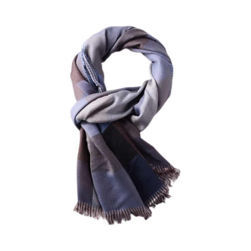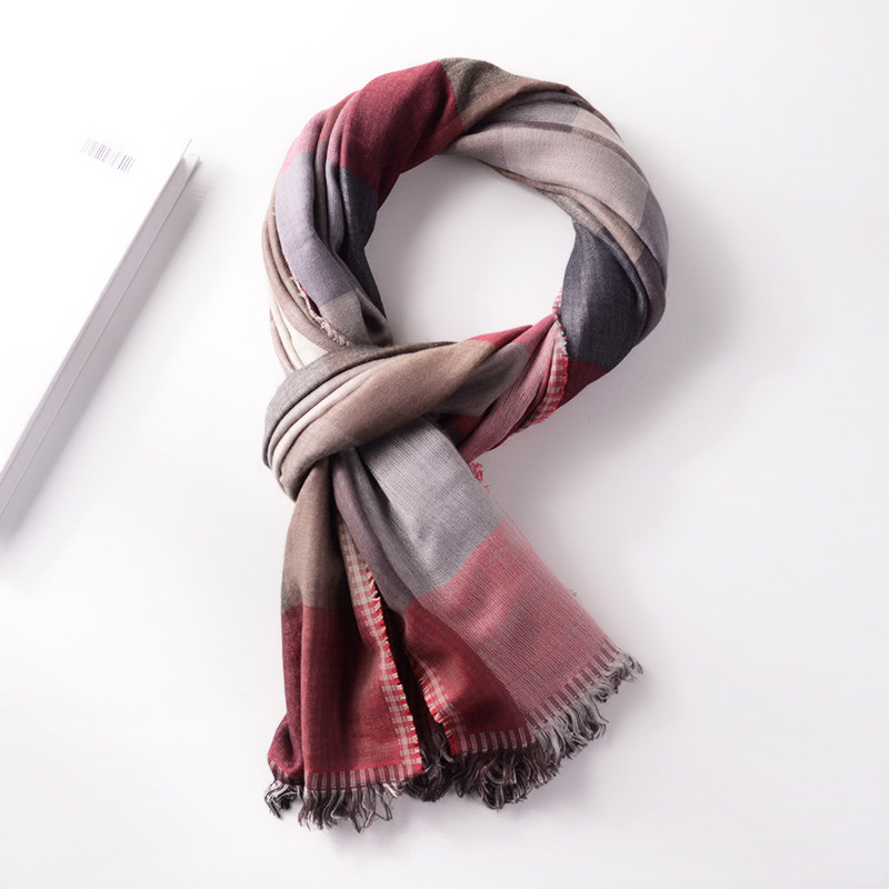 📚 双面双层秋冬男士围巾薄款休闲文艺百搭格子棉麻围巾红色藏蓝格子