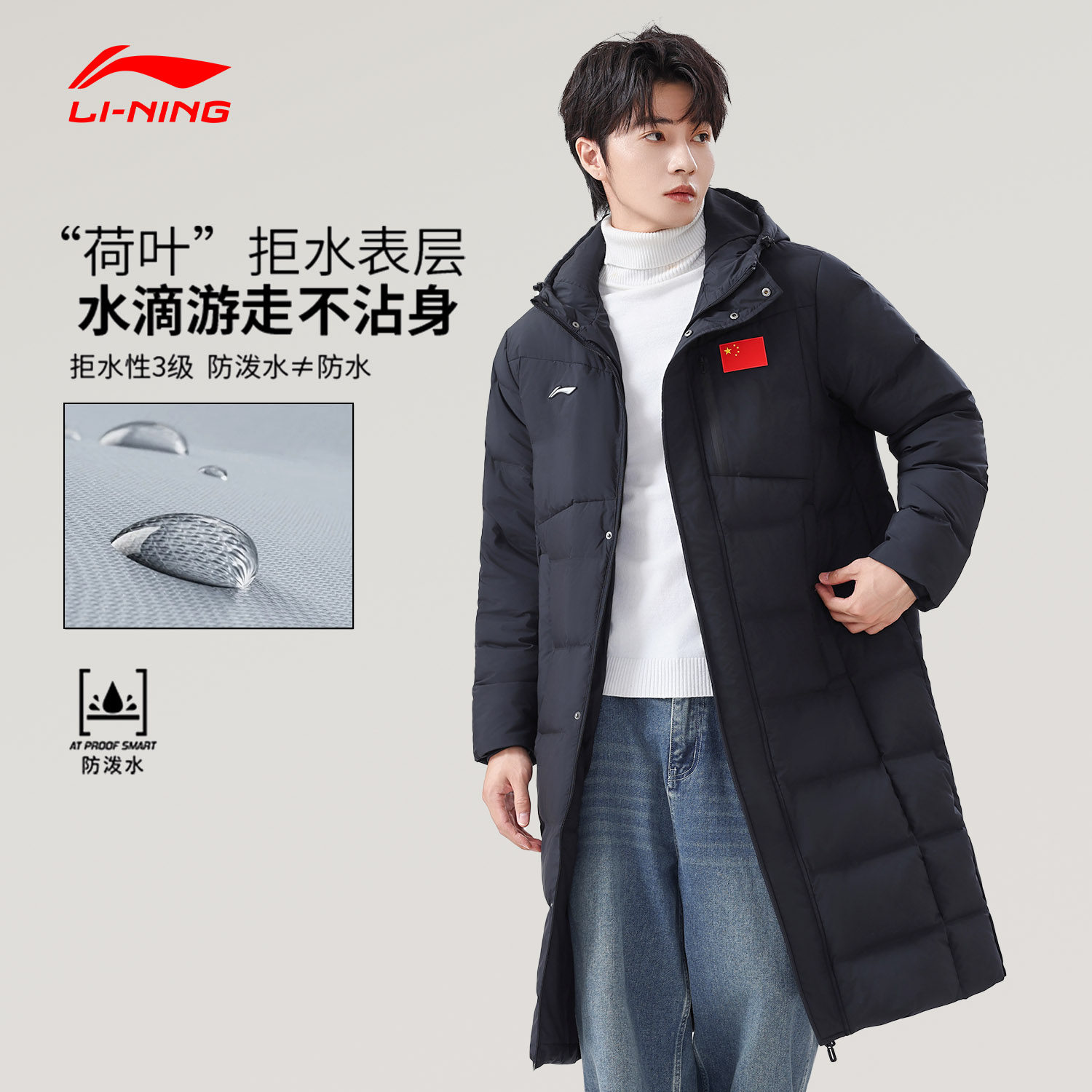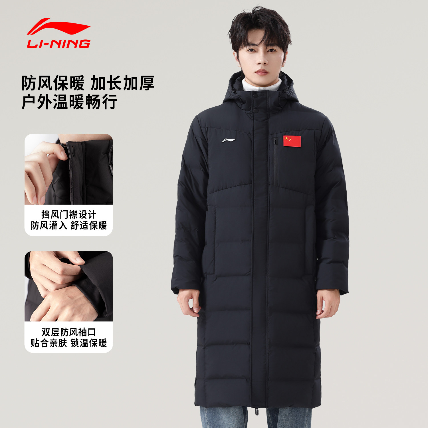 📚 李宁羽绒服男士冬季新款过膝长款带国旗鸭绒保暖运动外套连帽上衣