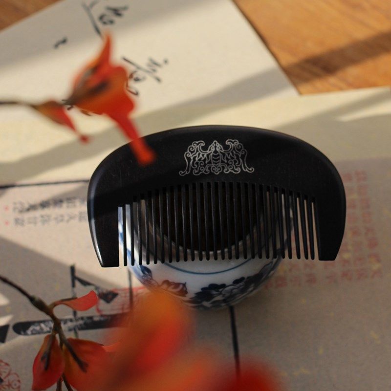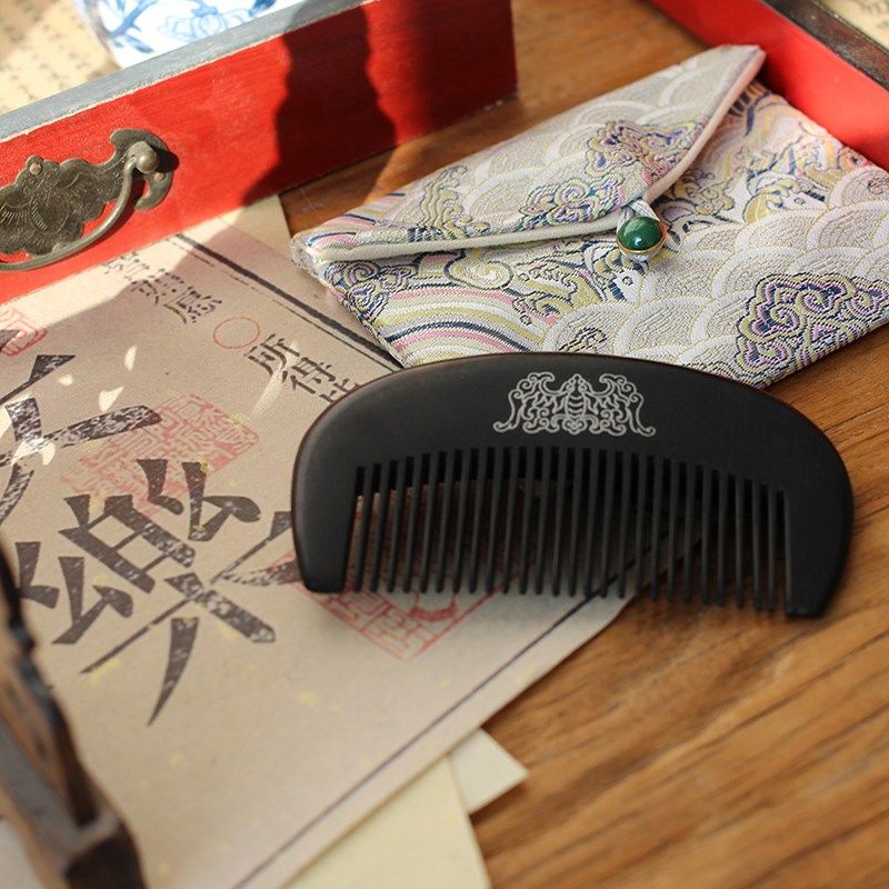 📚 福至 中式传统纹样及笄七夕文化礼物瑞兽镶银天然T黑檀木梳子 刻