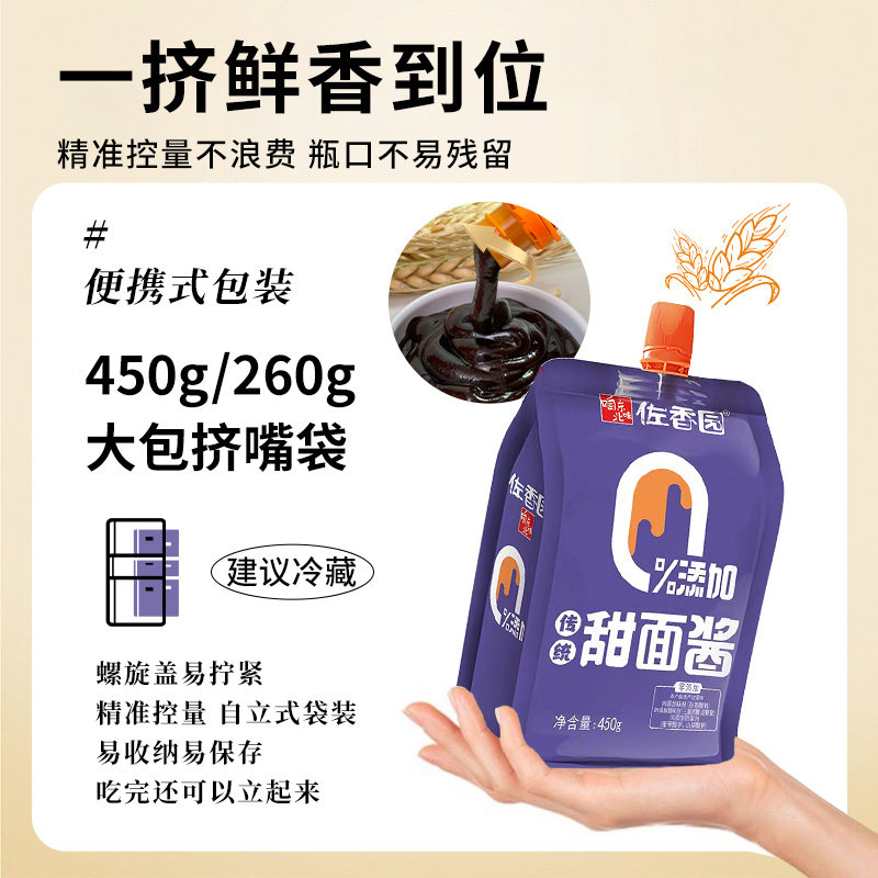 🍽️这款佐香园零添加甜面酱,真的是一袋在手,美食我有!450g的容量,让我一次就能满足全家人的需求。而且,它采用了无防腐剂制作,真的是太贴心了!烹饪炸酱面时,用它来蘸食老北京烤鸭,简直是绝配!