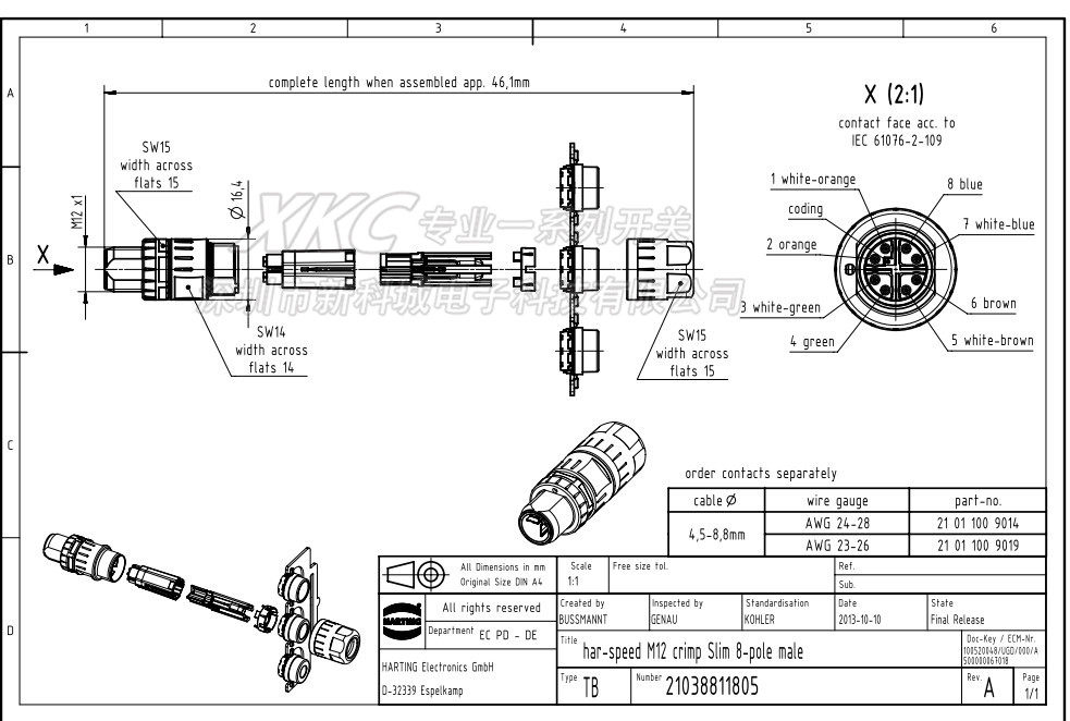 📚 进口原装 21038811805 压接 8针M12-8 公插针圆形连接器外壳 含针