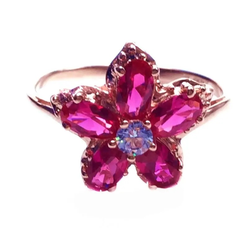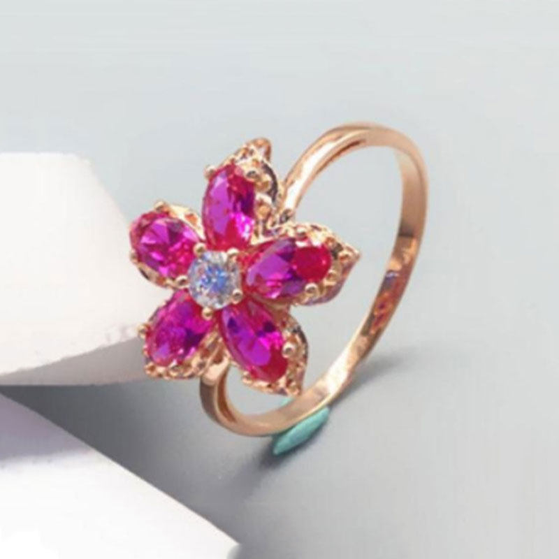 📚 俄罗斯585紫金镀14K玫瑰金气质闪亮花朵镶嵌玫红色宝石戒指时尚女