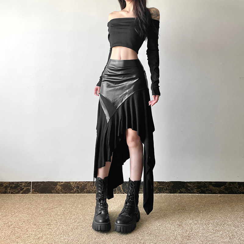 📚 怪诞女孩 暗黑系哥特风PU皮拼接高腰半身裙女 荷叶边修身不规则裙