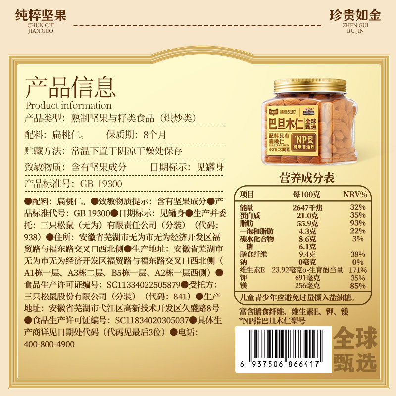 📚 臻选 三只松鼠罐装NP巴旦木仁杏仁扁桃仁坚果炒货休闲零食300g