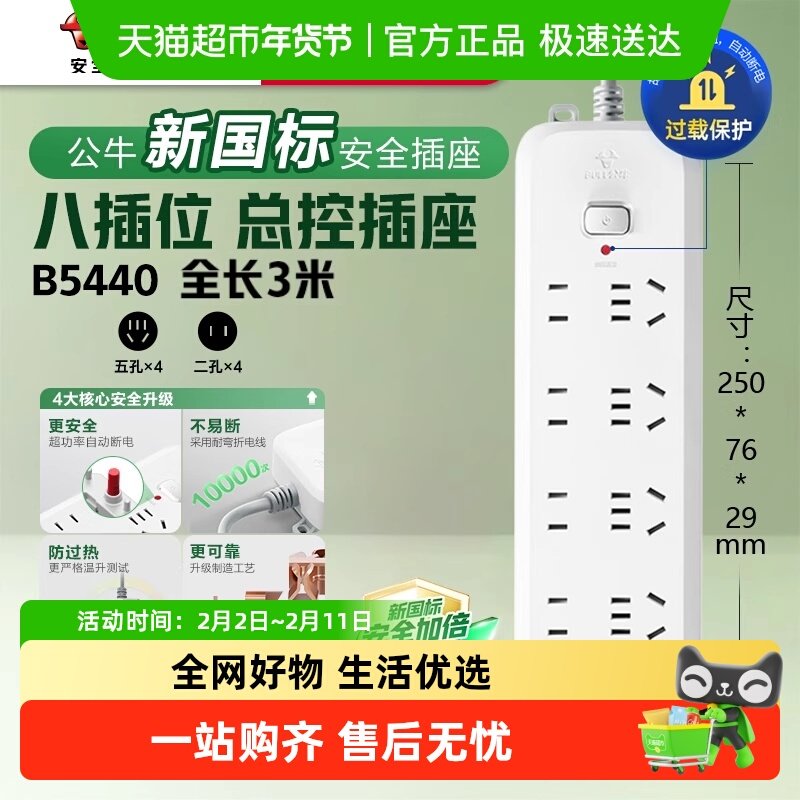 📚 公牛插座插排插线板拖线板插板带线家用多功能B5440全长3米