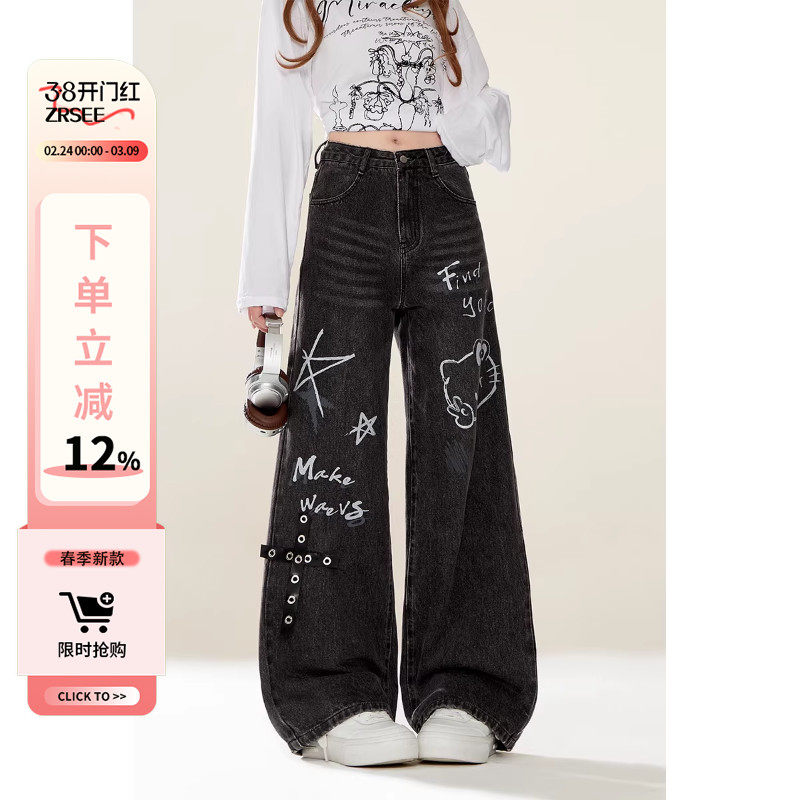 📚 自然涩黑色凯蒂猫印花直筒牛仔裤女春秋新款美式涂鸦阔腿裤子春季