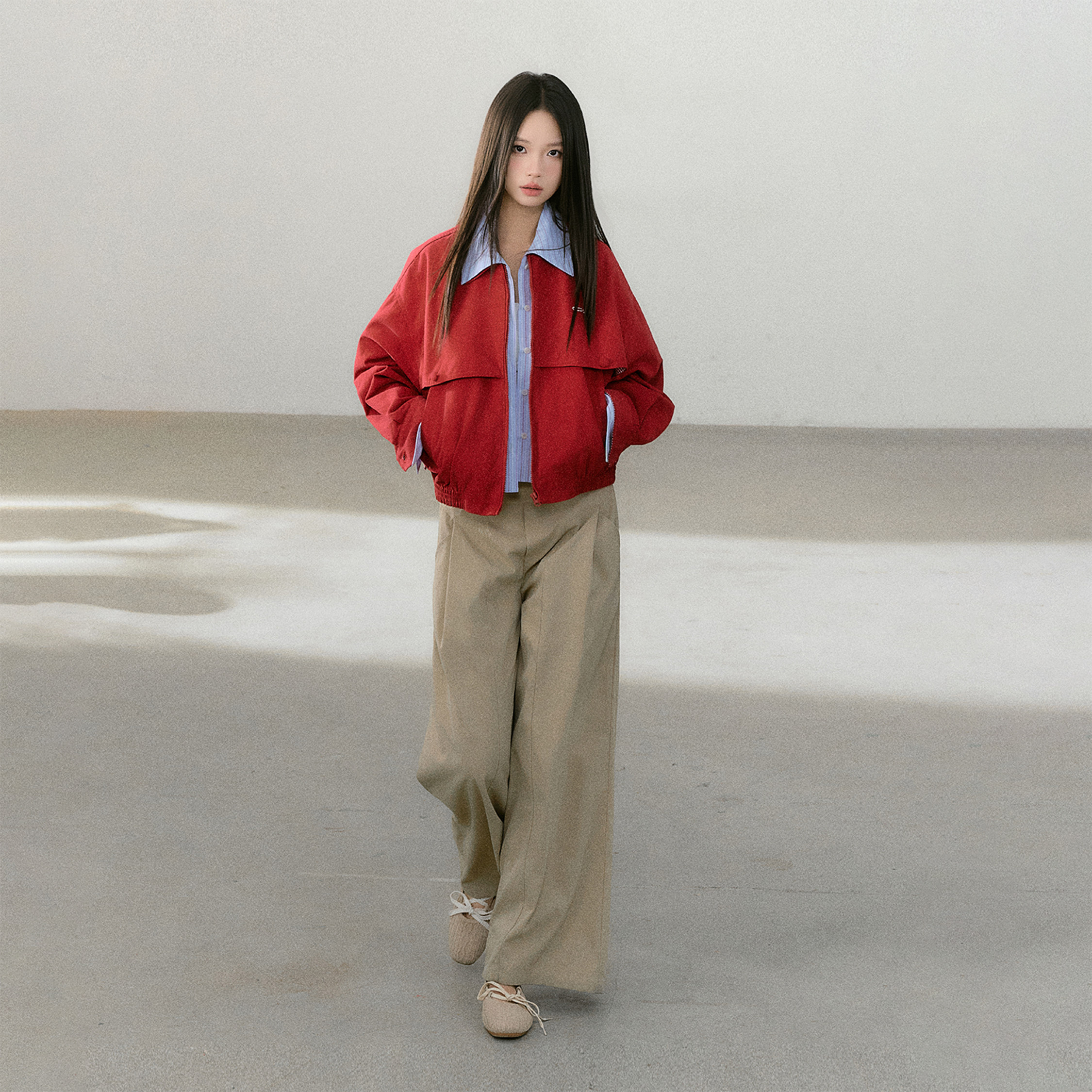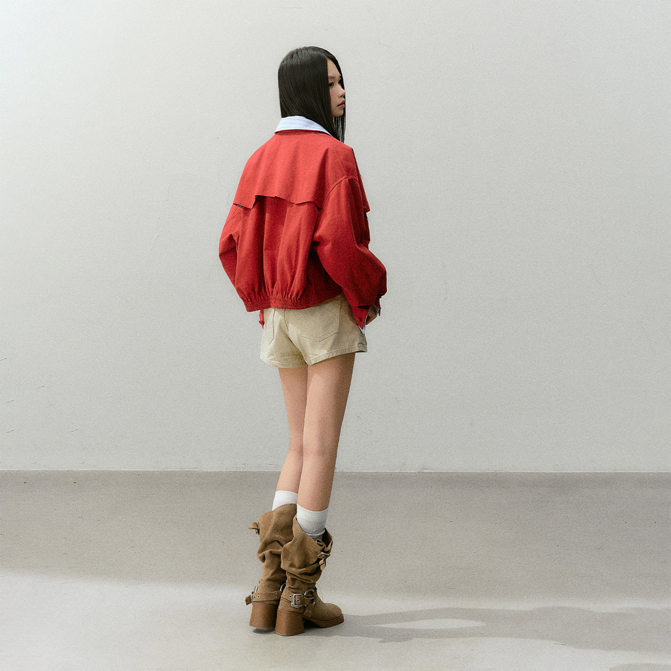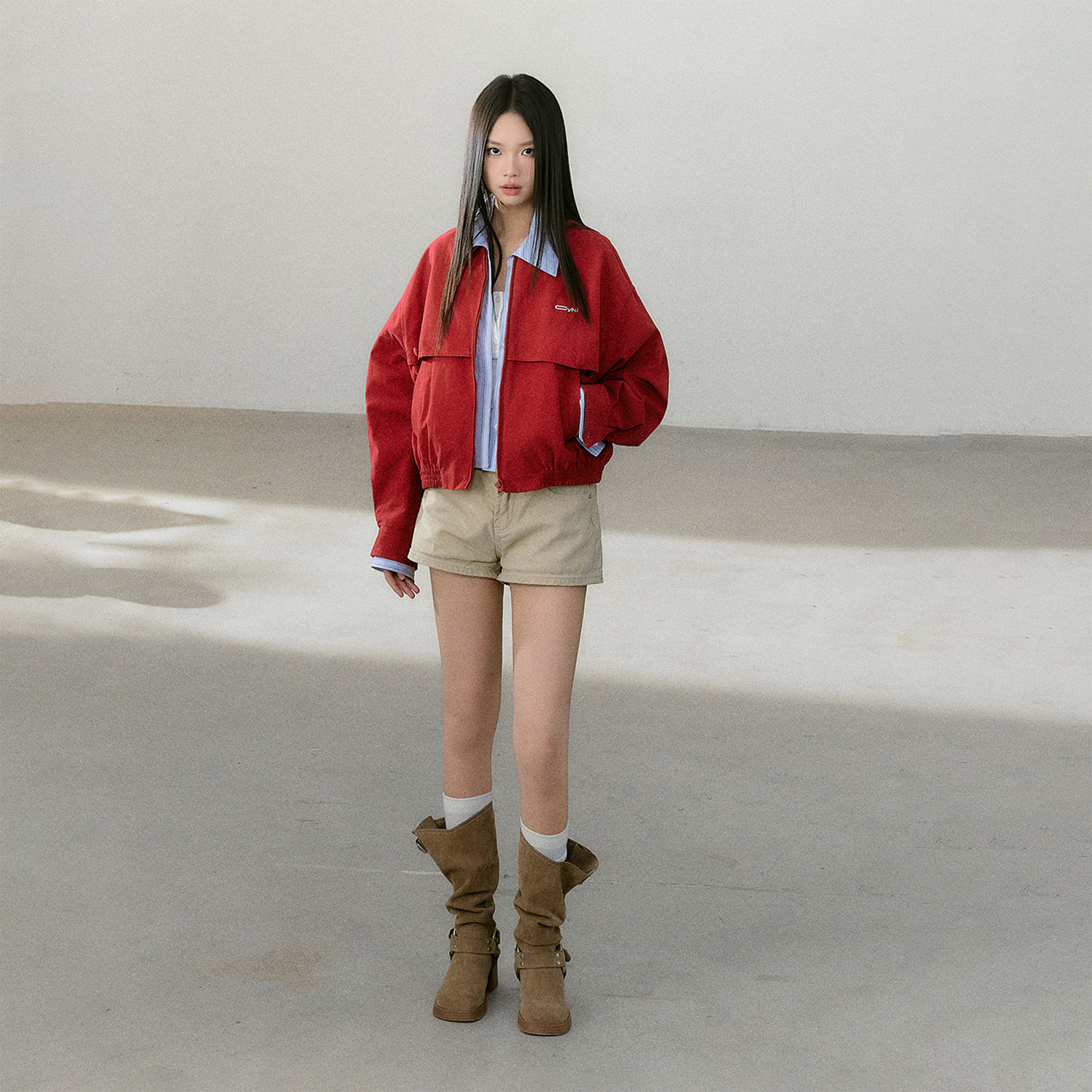 📚 CyNi【绯色光痕】精致假两件条纹衬衫拼接短款外套短款红色上衣