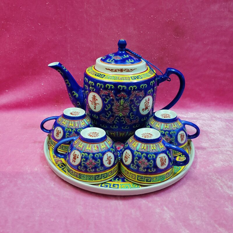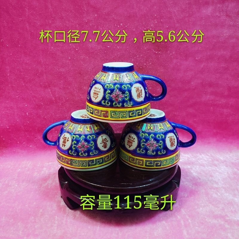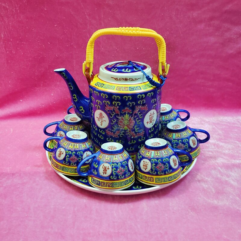 📚 万寿无疆茶具蓝色茶杯茶盅冲茶壶景德镇老式粉彩陶瓷复古水具套装