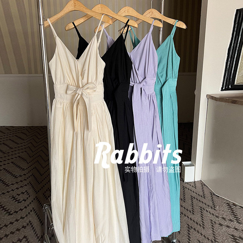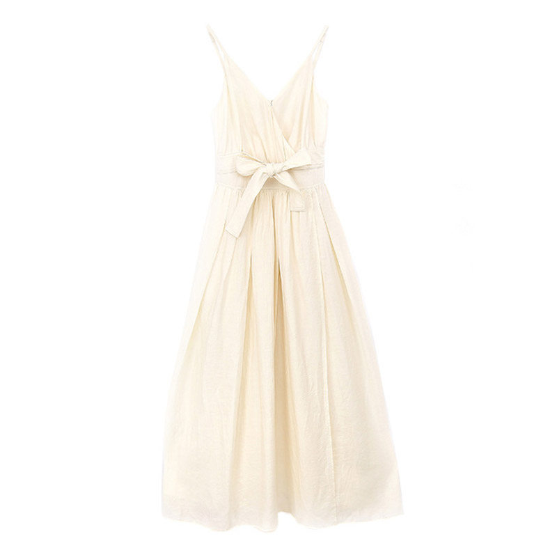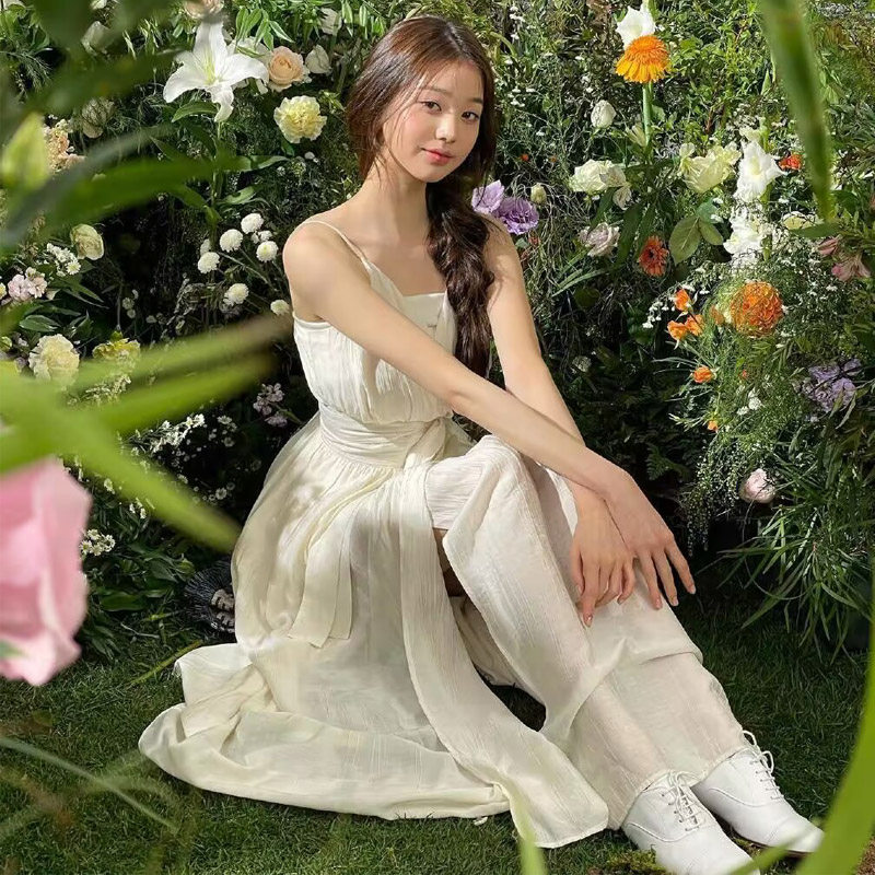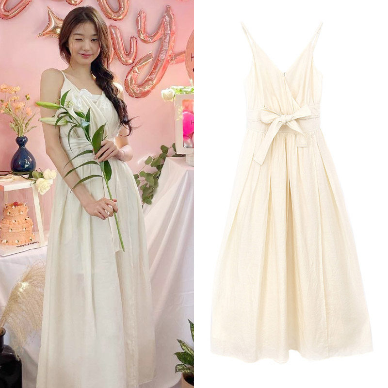 📚 张元英明星同款杏色系带开叉吊带连衣裙女收腰v领长裙仙女小白裙