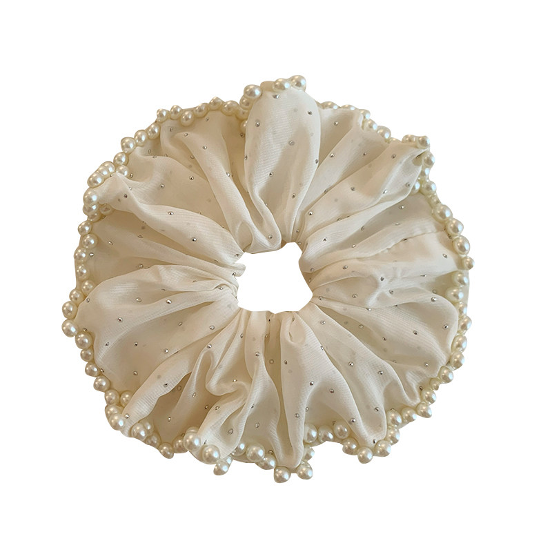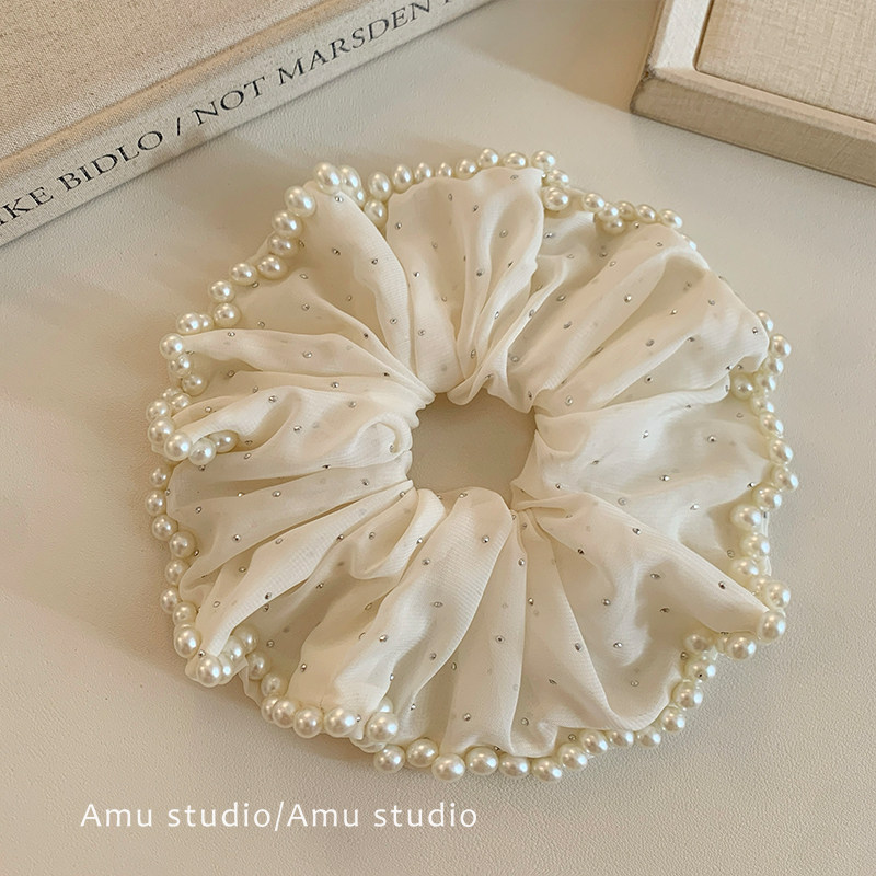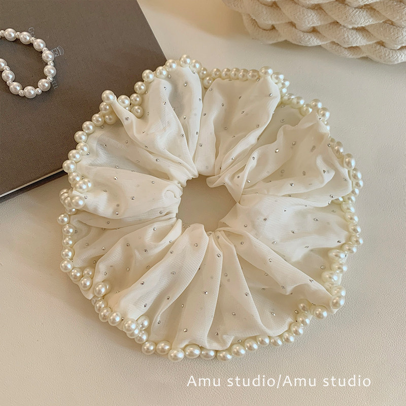📚 高级感珍珠满天星水钻网纱大肠发圈女甜美扎头发侧低马尾发绳头绳
